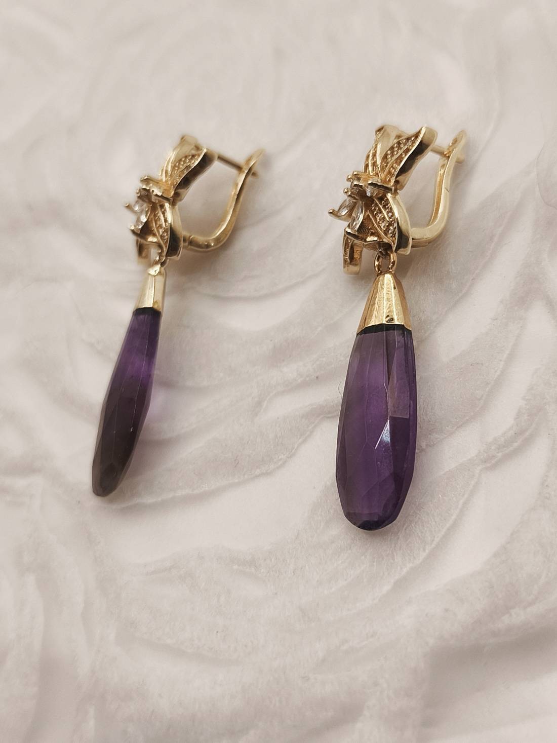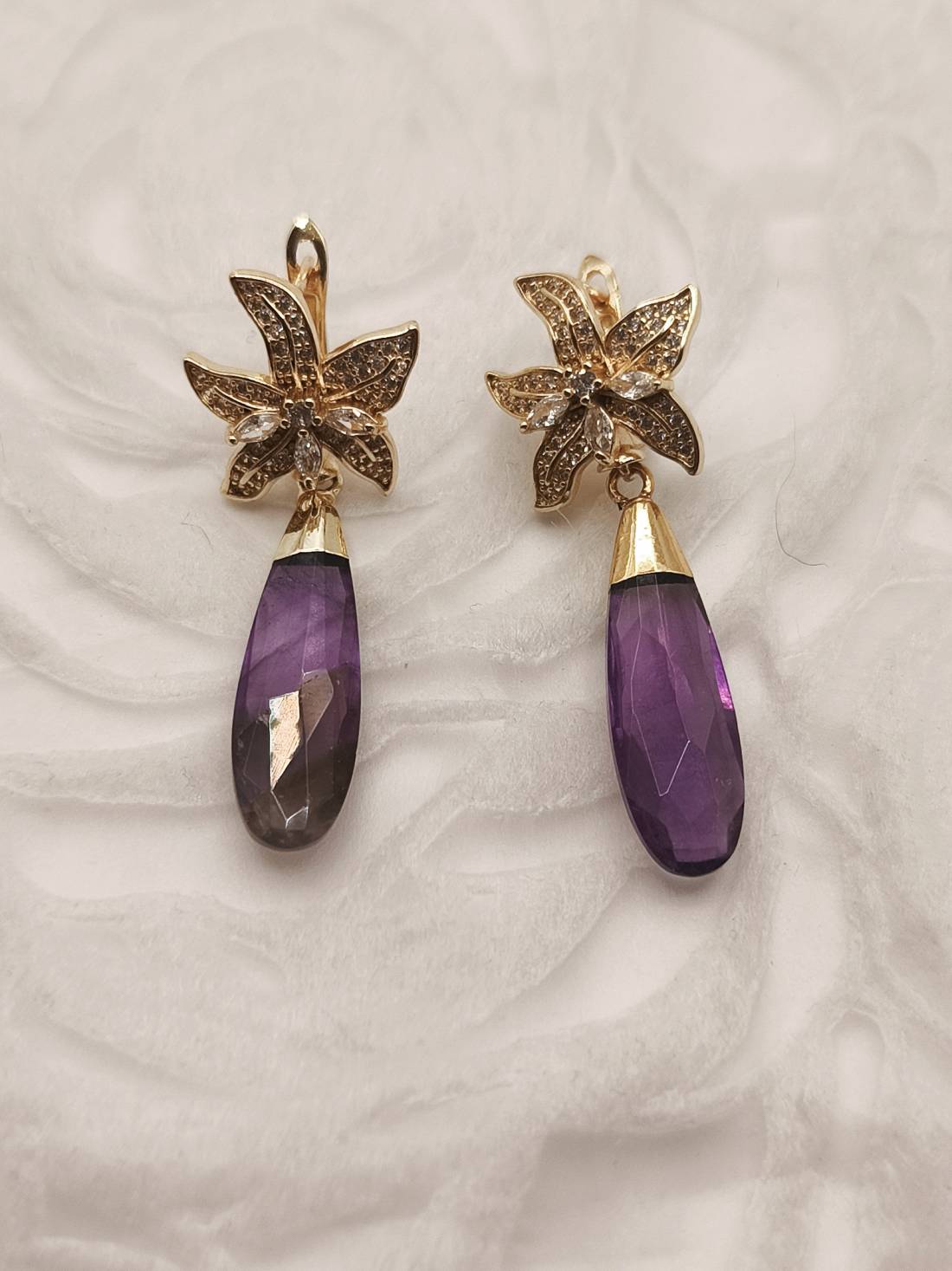Handmade drop earrings from the Amavero collection, blending the mystical allure of amethyst with an intricate, embossed design. The natural amethyst semi-precious stone, featuring an elongated teardrop shape with faceted cut, hangs from a stunning flower-shaped base adorned with sparkling cubic zirconia. The combination of the deep purple hue and the warm gold plating adds a sense of aristocratic elegance, making them a perfect choice for looks that exude femininity and luxury.