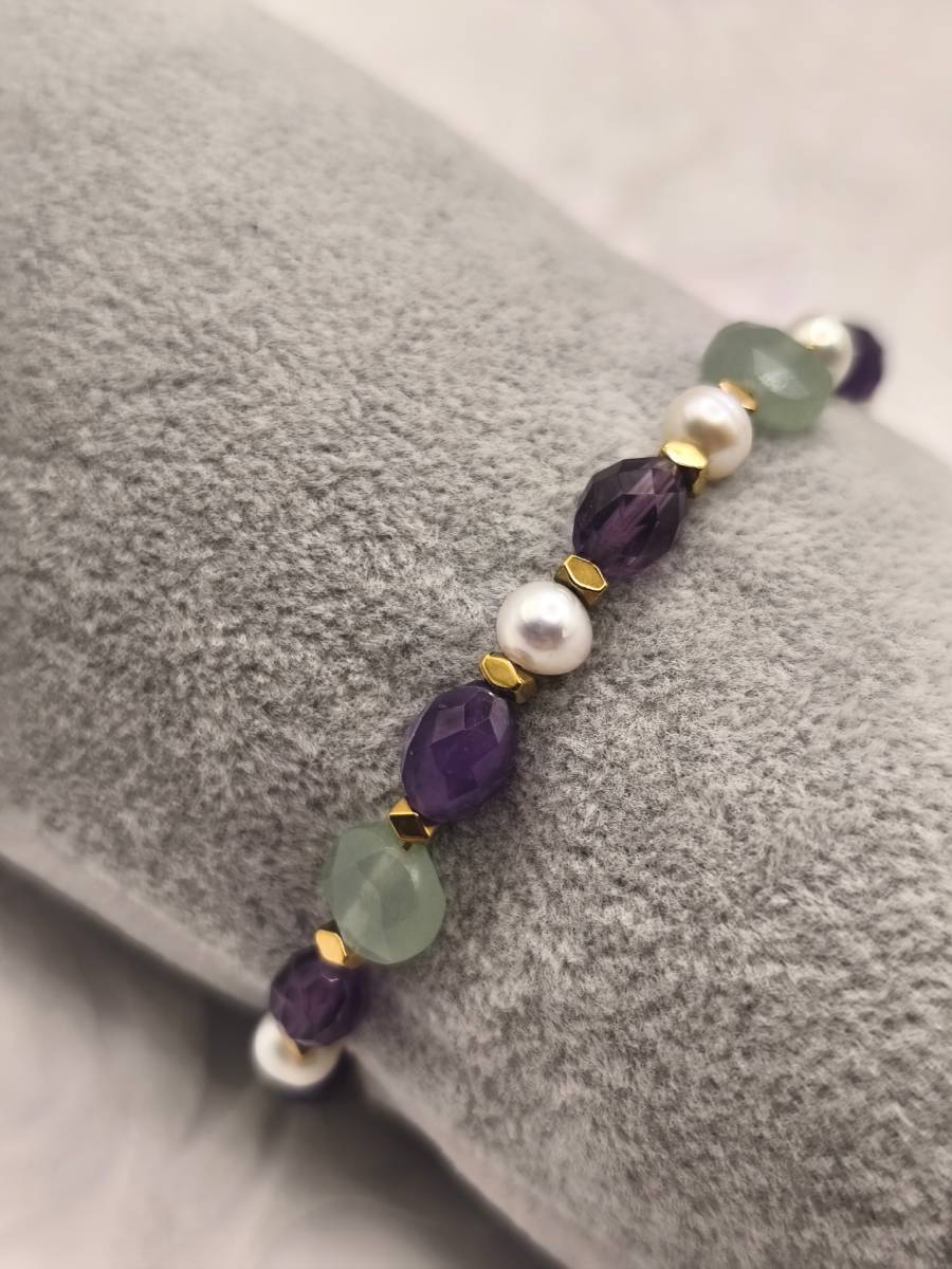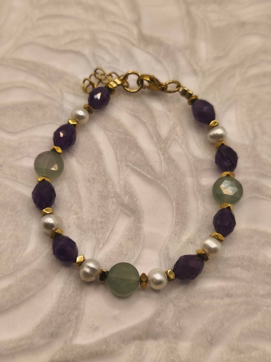 - Materials: Faceted Amethyst, Green Aventurine, Natural Pearls, Hematite elements.