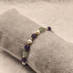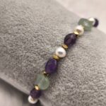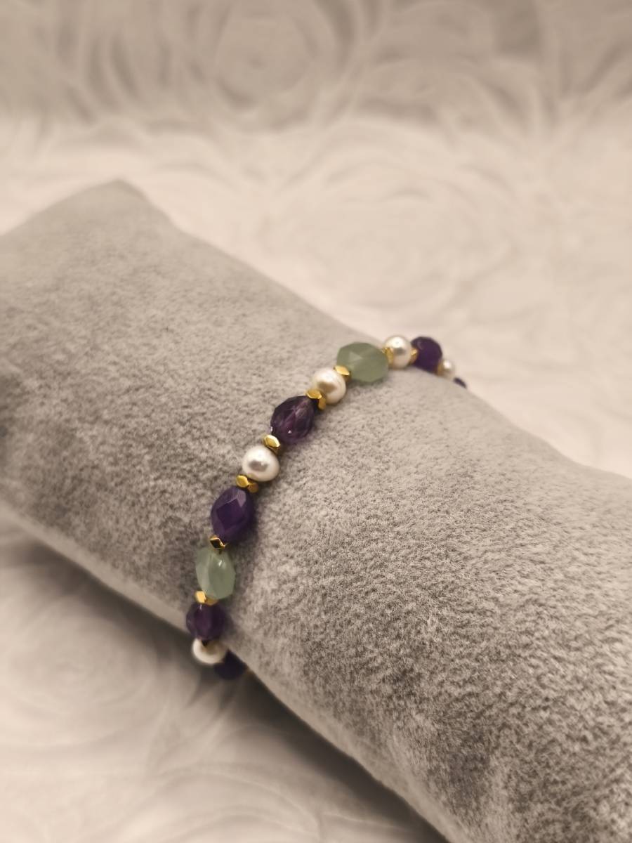 A piece of jewelry that celebrates the color harmony of nature! This handcrafted bracelet combines the mysterious purple hues of amethyst with the serene energy of green aventurine and the classic brilliance of natural pearls. The gemstones stand out for their unique, irregular faceted shape, which lends an organic and modern aesthetic to the piece. Golden hematite accents provide the perfect sparkle without the use of additional metallic elements, making it the ideal choice to illuminate any look with finesse and character.