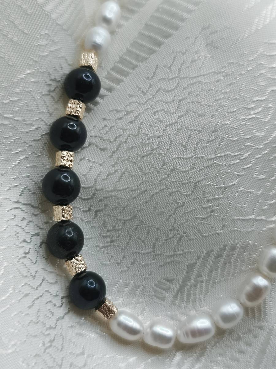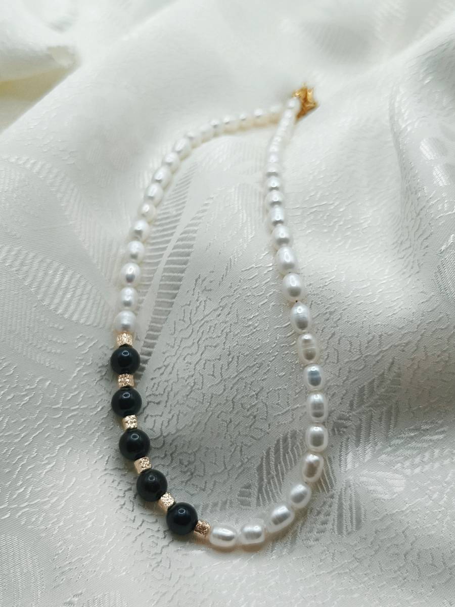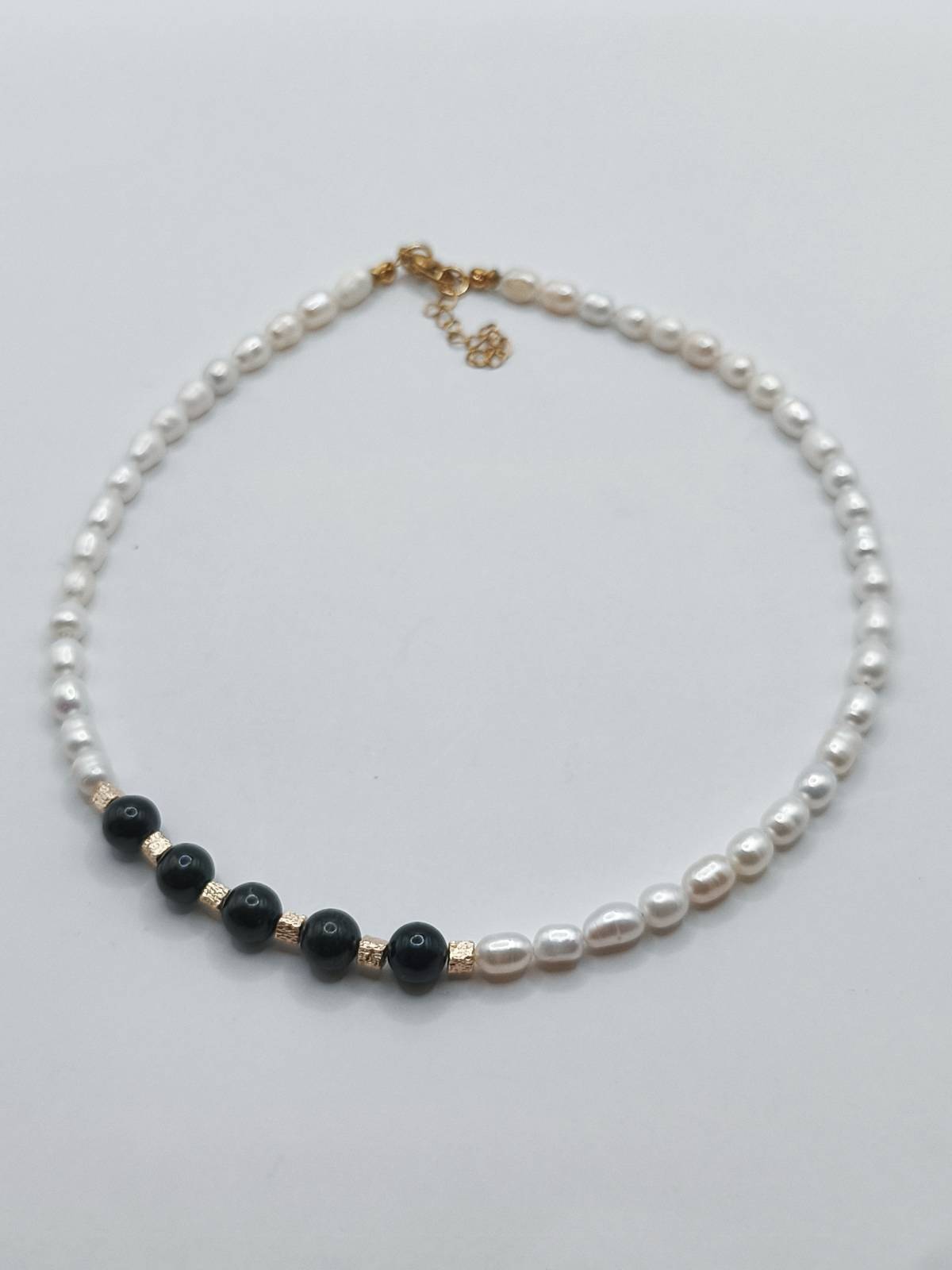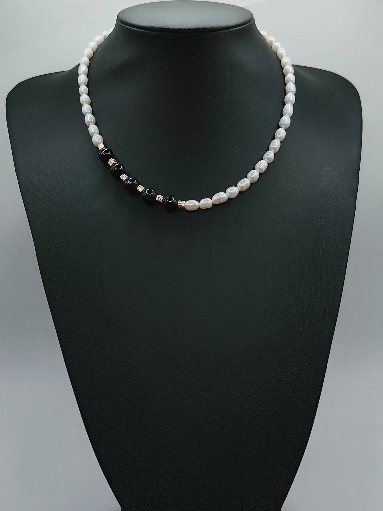 Handmade necklace crafted from cultured freshwater pearls. The pristine white pearls are elegantly interrupted by five black pearls adorning one side, creating a sophisticated asymmetrical look. The gold plated brass elements provide a radiant finish, adding a luxurious touch to this unique piece.