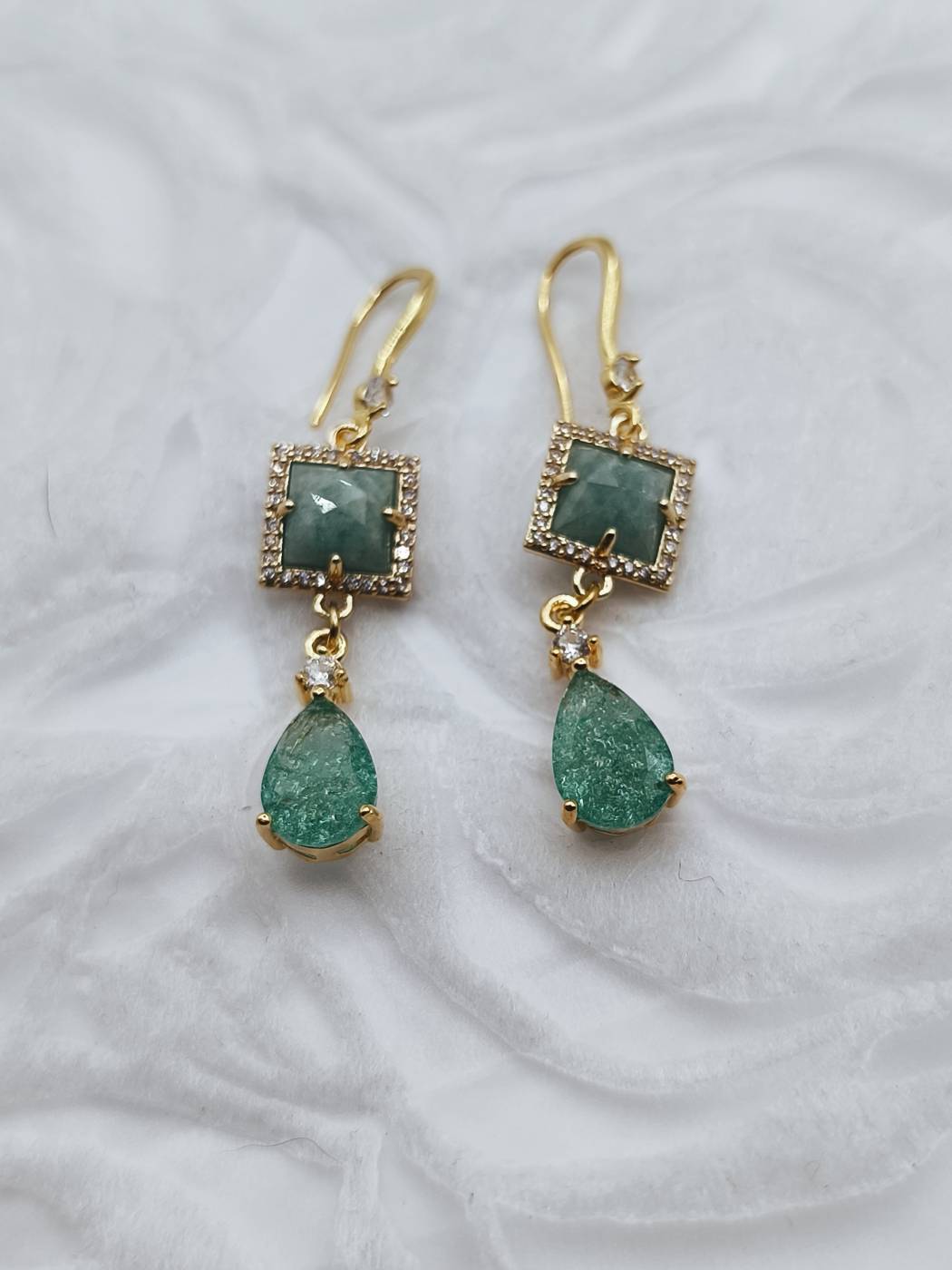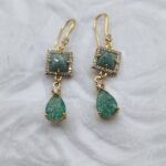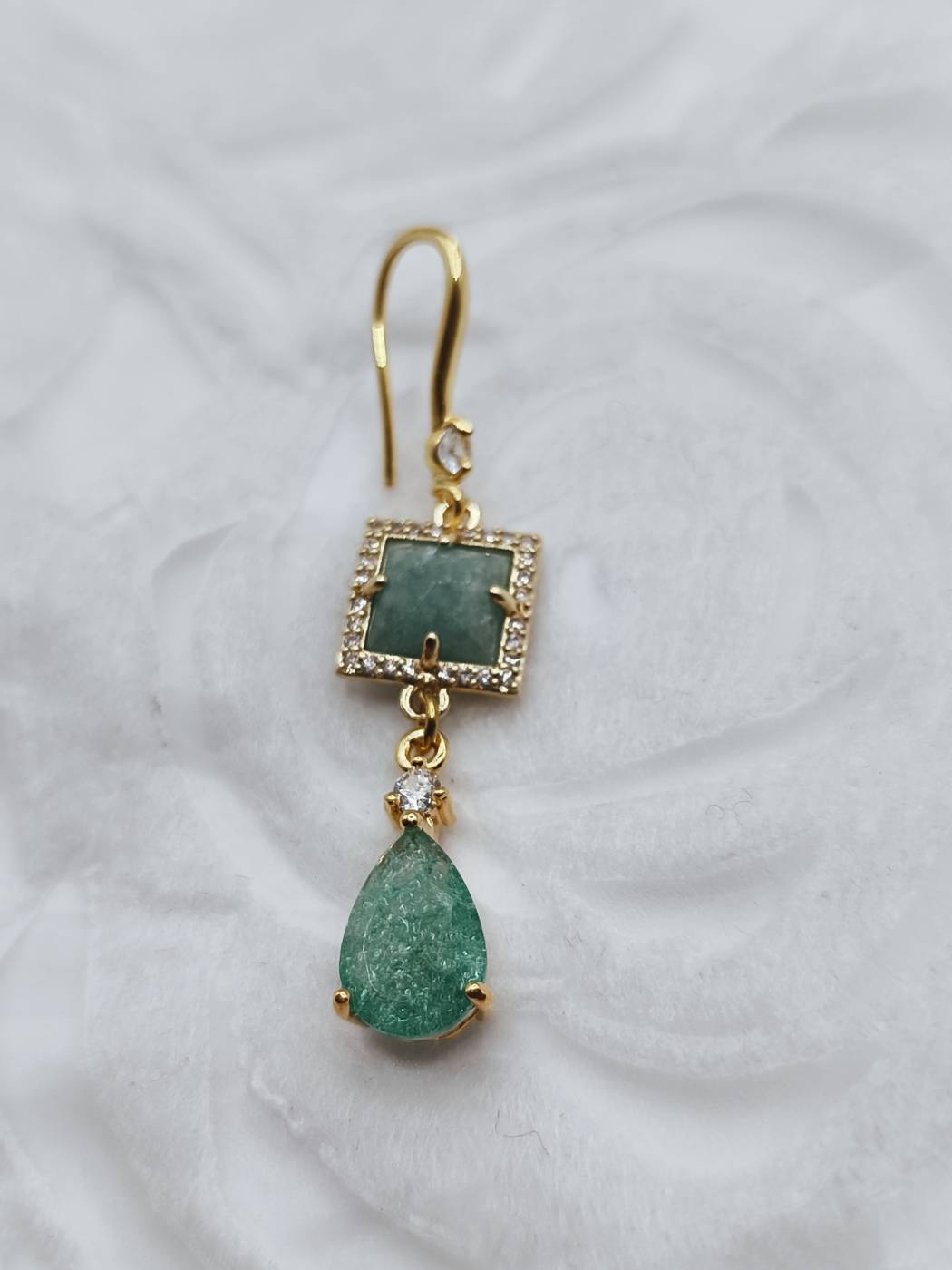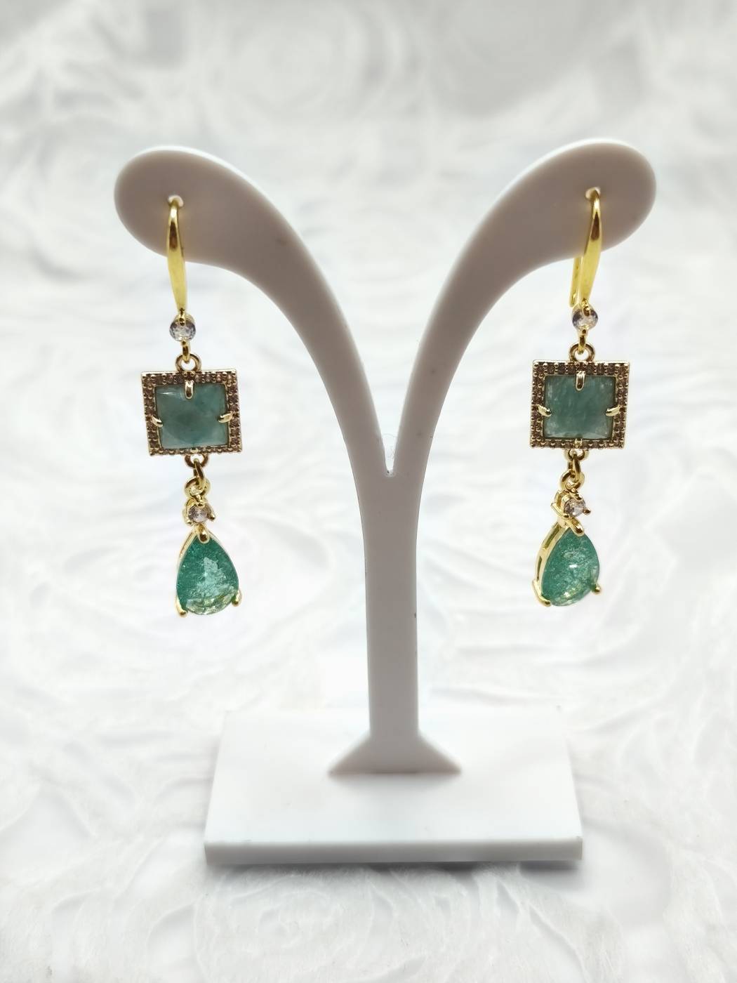 - Materials: Amazonite semi-precious stone, Teal Cubic Zirconia (CZ) teardrop, clear zircons.