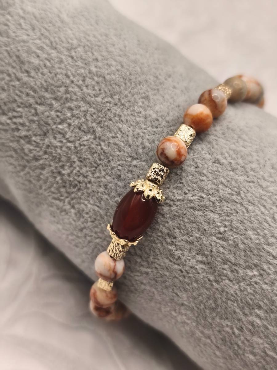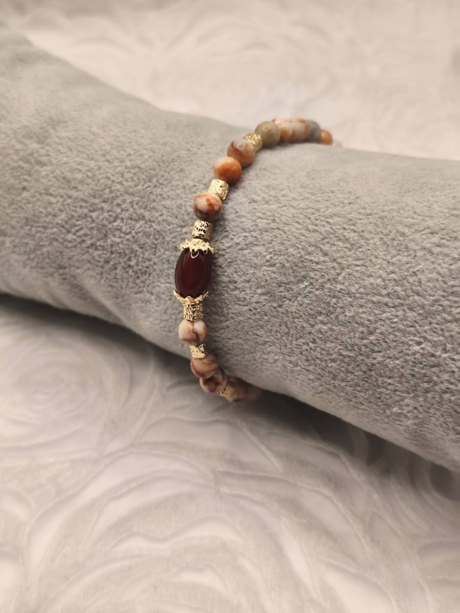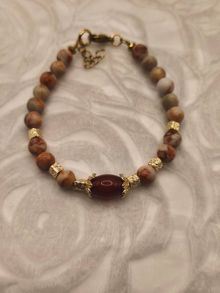 A piece of jewelry that exudes the warmth and strength of the earth! This handcrafted bracelet combines the natural, earthy hues of Jasper with a striking central Agate stone in a deep terracotta shade. The intricate 14K gold-plated brass elements embrace the central stone, adding a sense of vintage luxury and timeless elegance. A statement piece from the AMAVERO collection, perfect on its own or layered with other bracelets. Complete your look by pairing it with the matching necklace from our collection for a perfectly harmonized and powerful jewelry set!