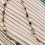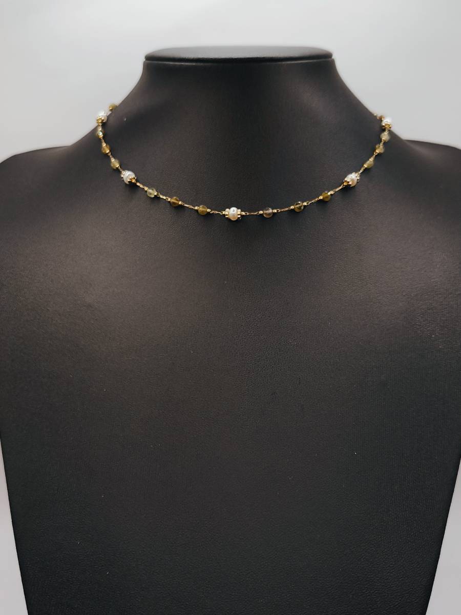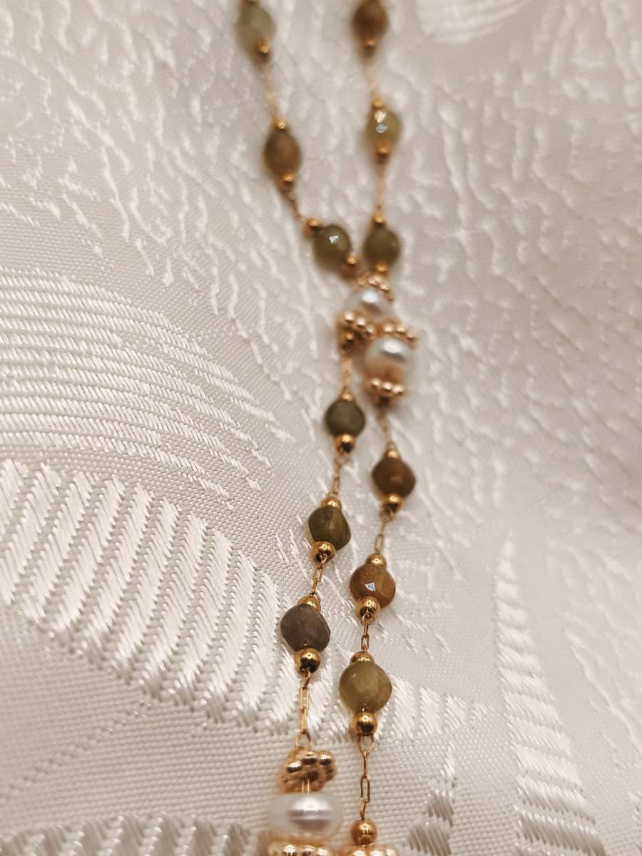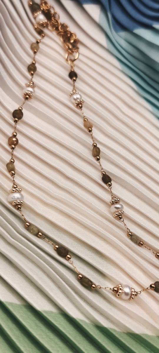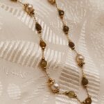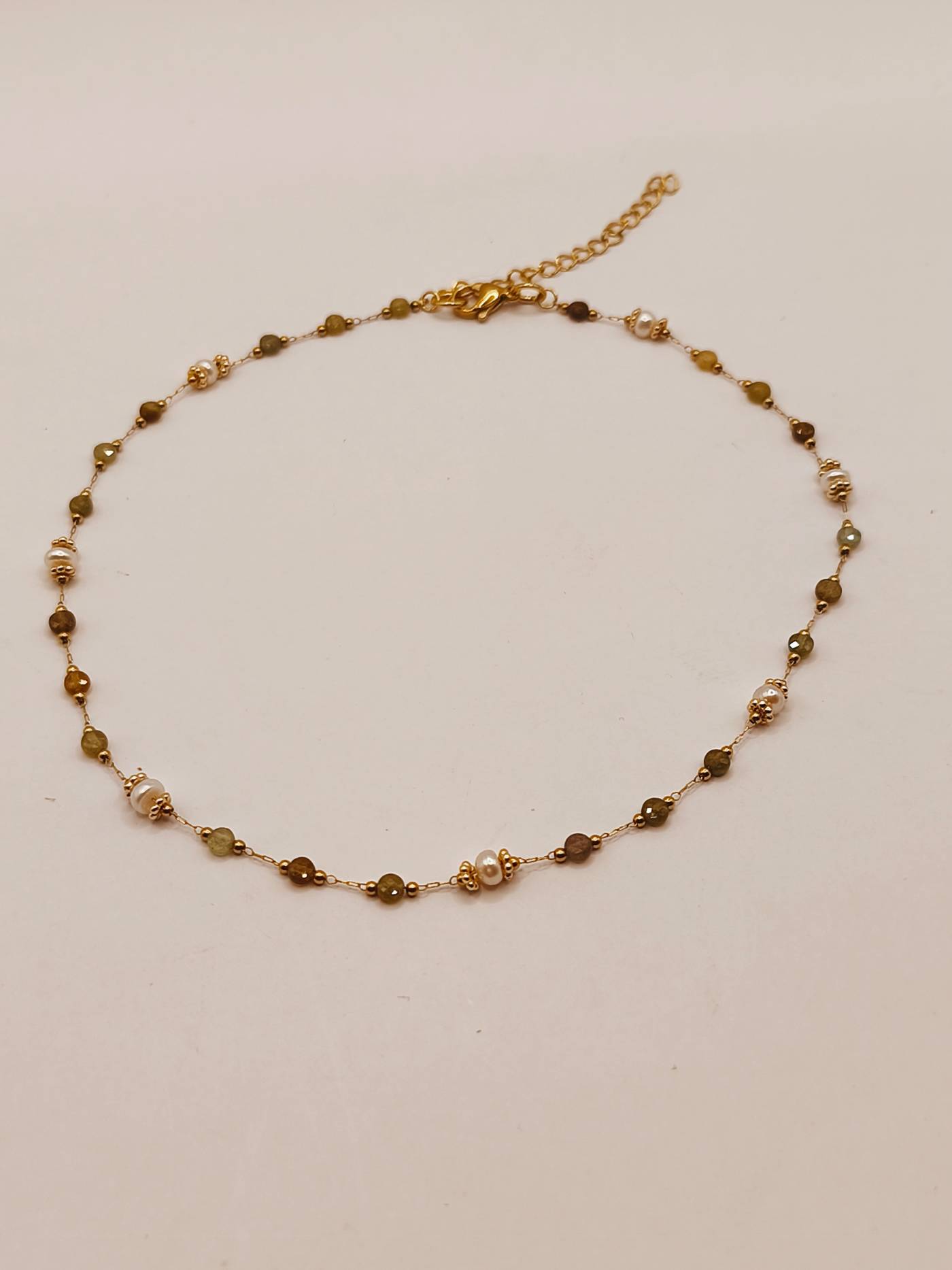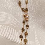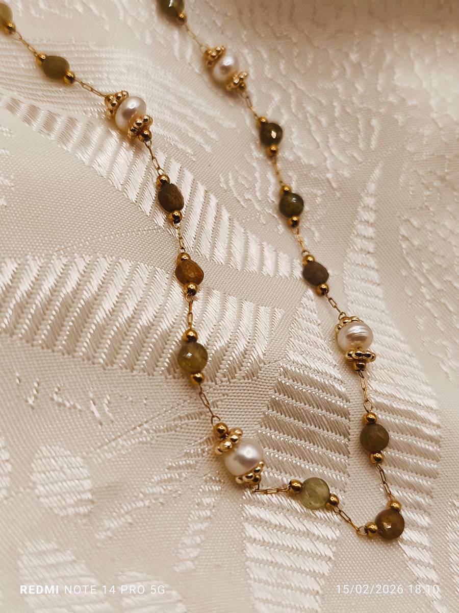 Rosary necklace featuring green garnet semi-precious stones and genuine cultured pearls. A delicate and fresh piece of jewelry that blends nature’s vibrancy with the classic charm of pearls. Its dainty design makes it perfect for layering or as a beautiful first piece of jewelry for our little princesses. Discover the rest of the Amavero Green Garnet collection and create your own unique combinations!