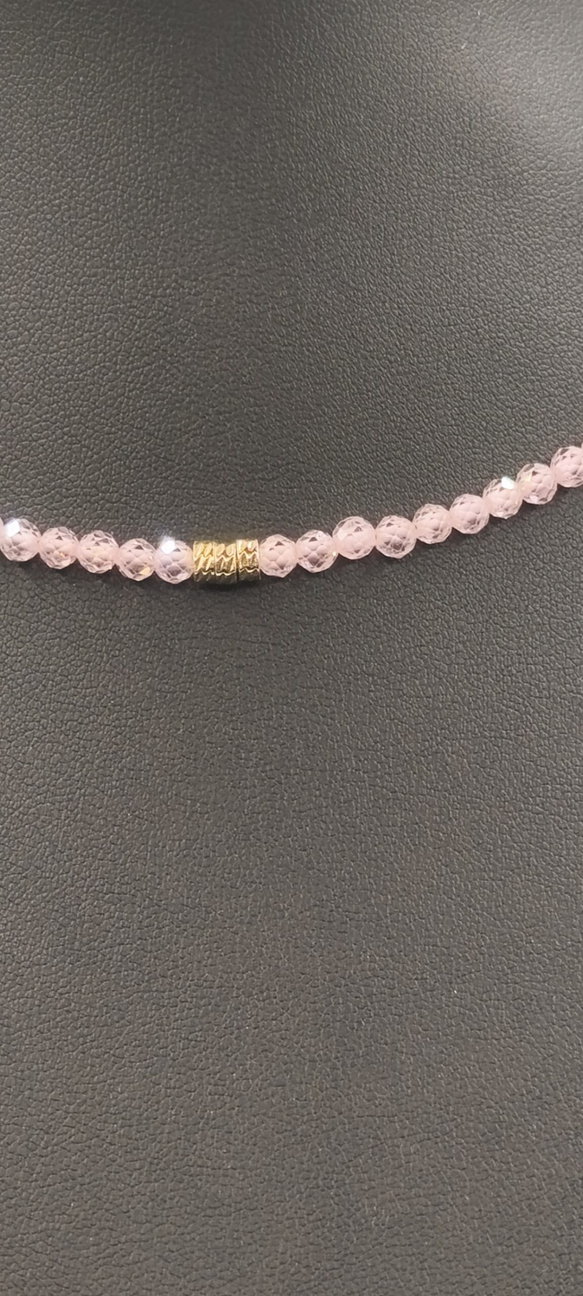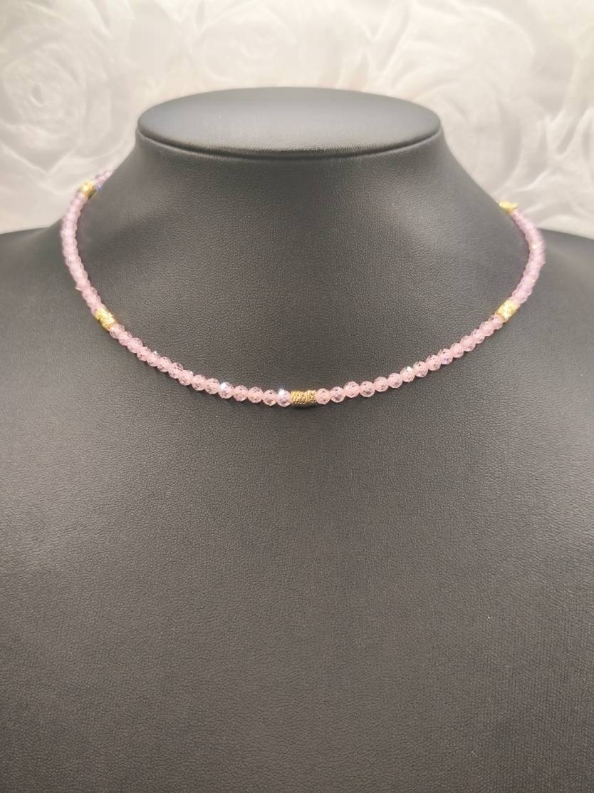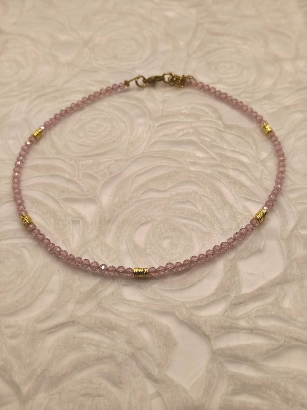 A delicate necklace that radiates sweetness and brilliance! This elegant handcrafted piece features faceted Cubic Zirconia (CZ) crystals in a soft pink hue, harmoniously interspersed with shimmering gold-plated brass accents. Its dainty design makes it the ideal choice for any woman who loves minimal style, as well as the perfect gift for our “little princesses” who wish to add a touch of fairytale sparkle to their outfits. Complete your look by pairing it with the matching bracelet from our collection for a vibrant jewelry set!
