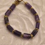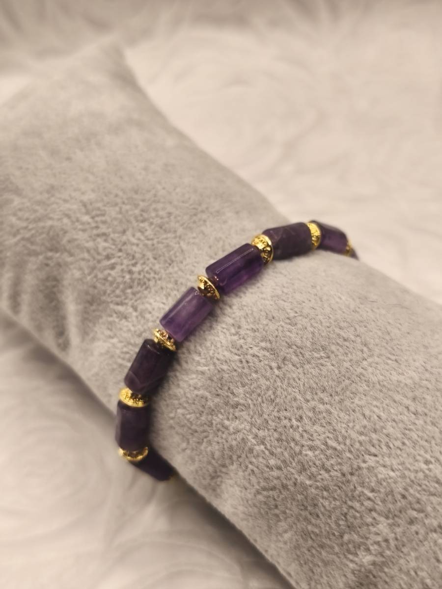 A piece of jewelry that exudes regal tranquility and modern aesthetic! This handcrafted bracelet highlights the Amethyst gemstone through a unique cylindrical shape (tube beads), lending a geometric yet organic charm. The deep purple hues of the stone alternate harmoniously with intricate textured gold-plated brass accents, creating a sense of vintage luxury. Amethyst is renowned as the stone of spiritual clarity and peace, making this AMAVERO bracelet the perfect accessory to add depth and finesse to any look.