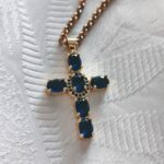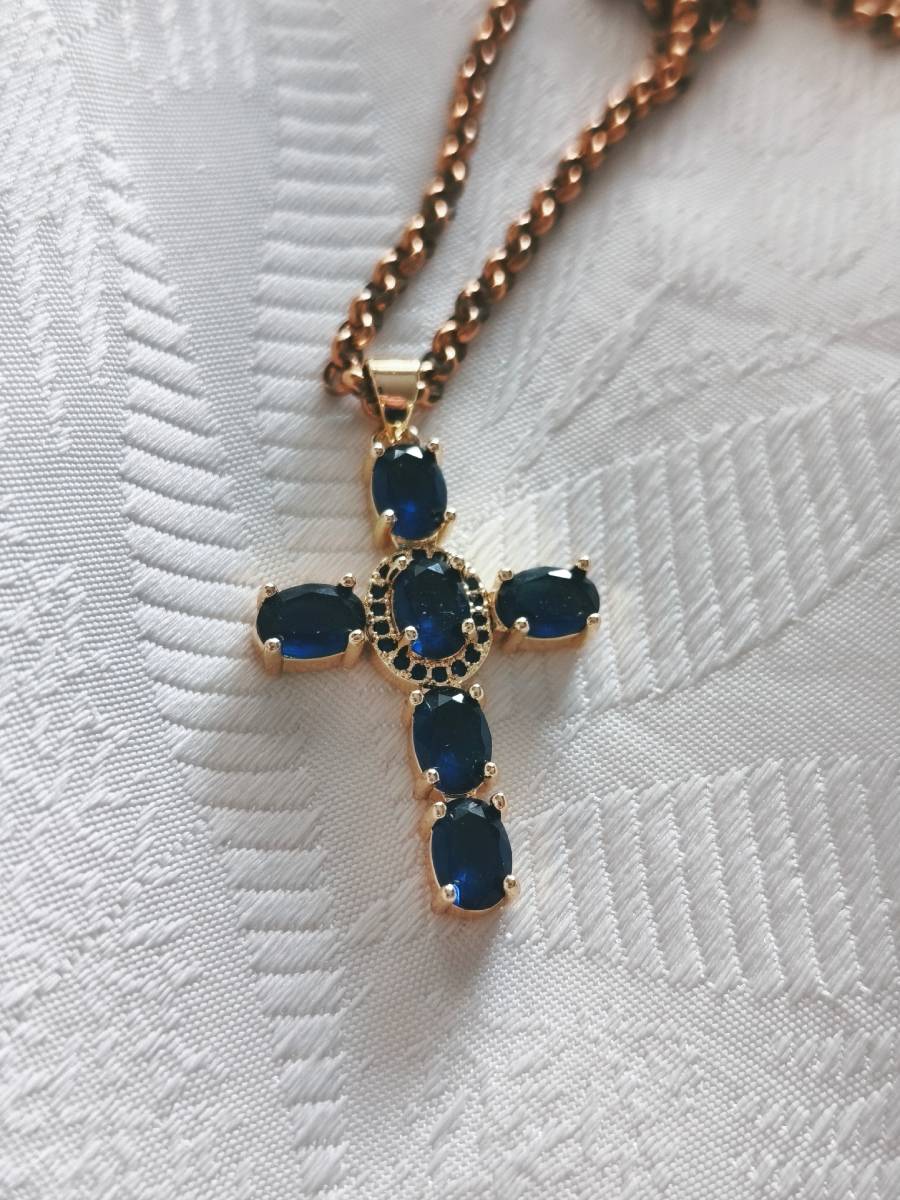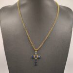 A piece of jewelry that exudes aristocratic finesse and timeless elegance. This AMAVERO necklace features a delicate gold-plated brass cross, adorned with deep blue Cubic Zirconia stones reminiscent of rare sapphires. The oval stones are intricately connected by a gold circular element at the center, creating a design that marries tradition with modern aesthetics. Perfect for adding a touch of luxury and color to your every look, from day to night.