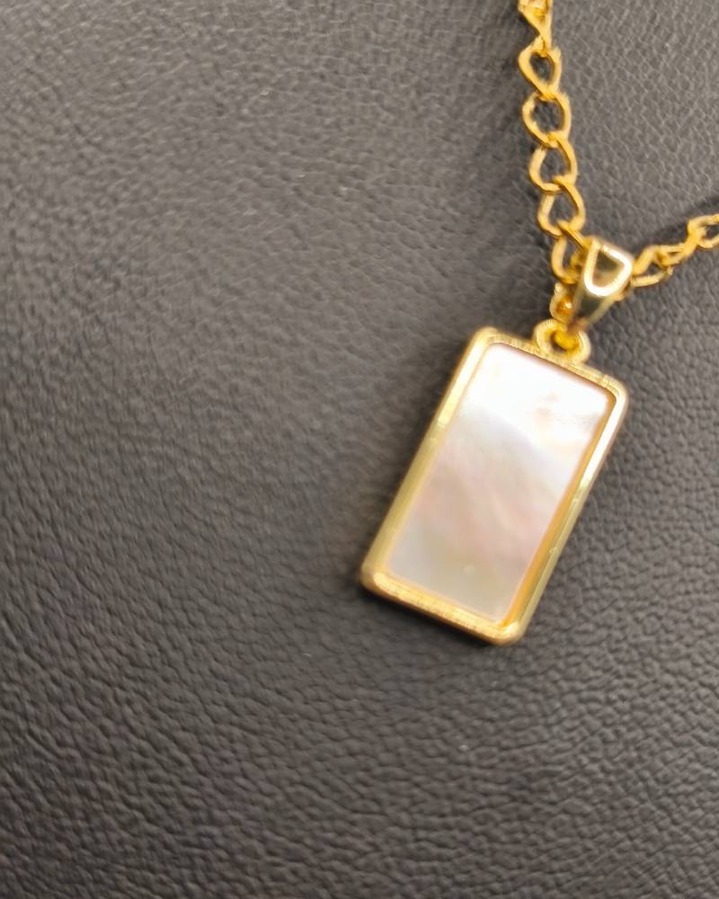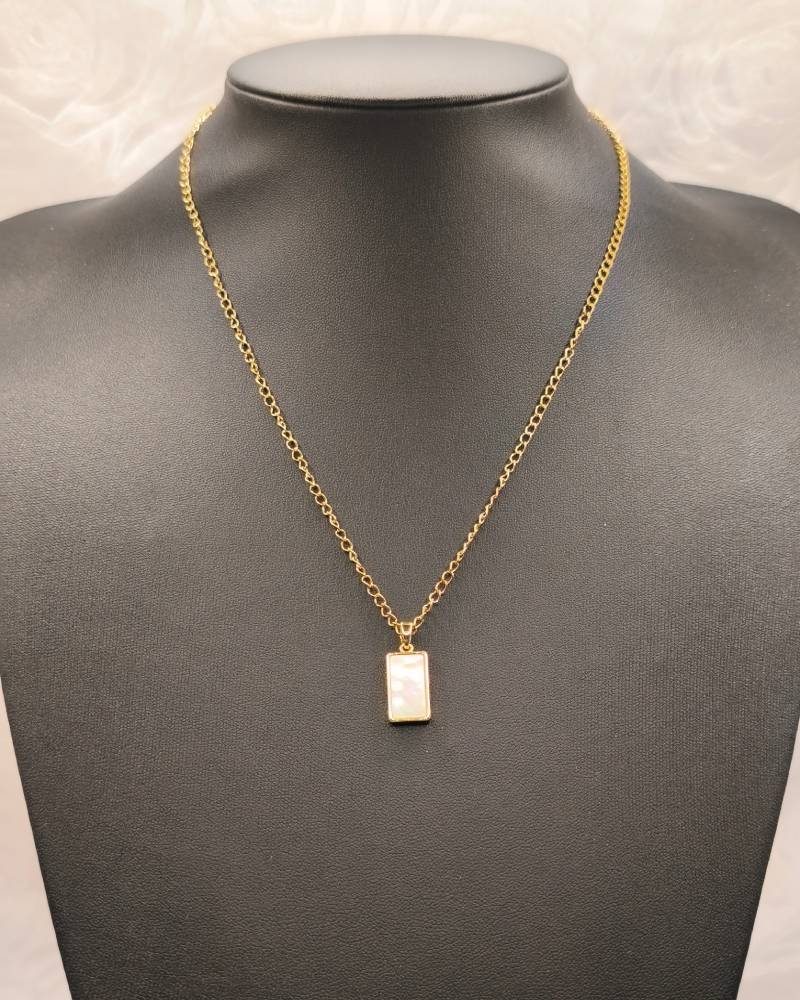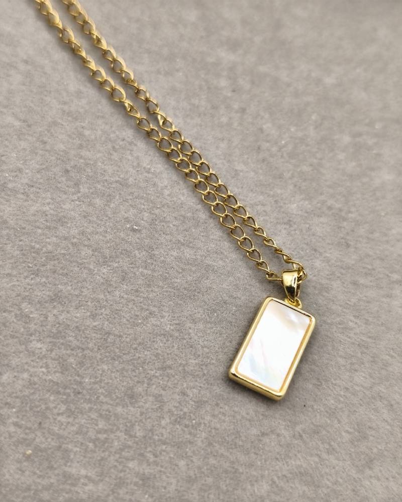 Timeless charm meets modern minimalism! This elegant handcrafted necklace features a rectangular pendant made of natural shell (mother of pearl), which softly iridesces with every movement. Its clean, geometric lines and delicate size make it the ultimate piece for layering. Perfectly paired with AMAVERO’s short gemstone necklaces or our signature rosaries, it allows you to create a personal and radiant style. Featuring a durable stainless steel chain and a gold-plated brass pendant, it is designed to accompany your every look with unsurpassed elegance.