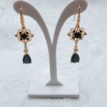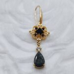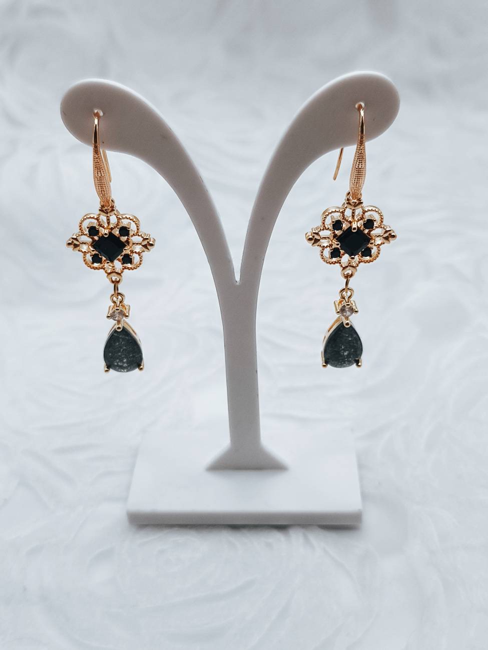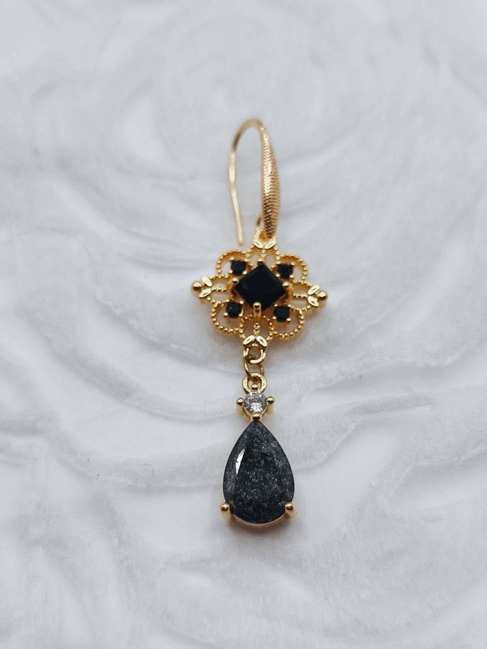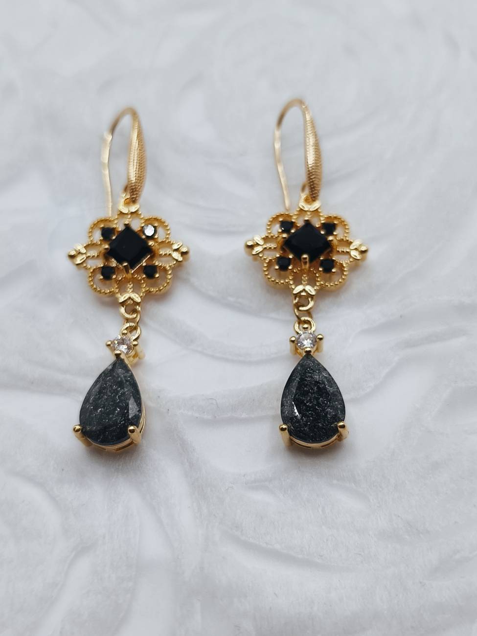 Handmade drop earrings from the Amavero collection, a piece of jewelry that balances vintage aesthetics with modern radiance. The design features the union of two distinct elements: an intricate embossed rhombus with a central black cubic zirconia, and an elegant black zircon teardrop dangling at the base. The combination of geometric shapes with warm gold plating imparts a sense of aristocratic luxury, making them perfect for elevating any formal or evening look.