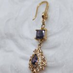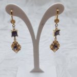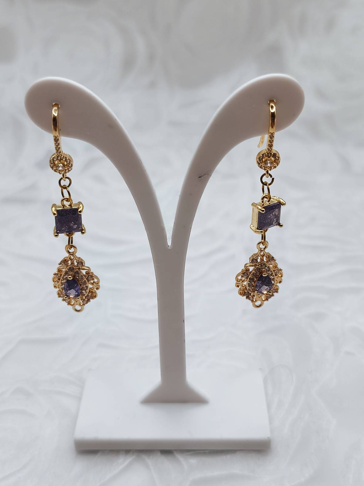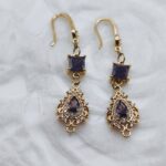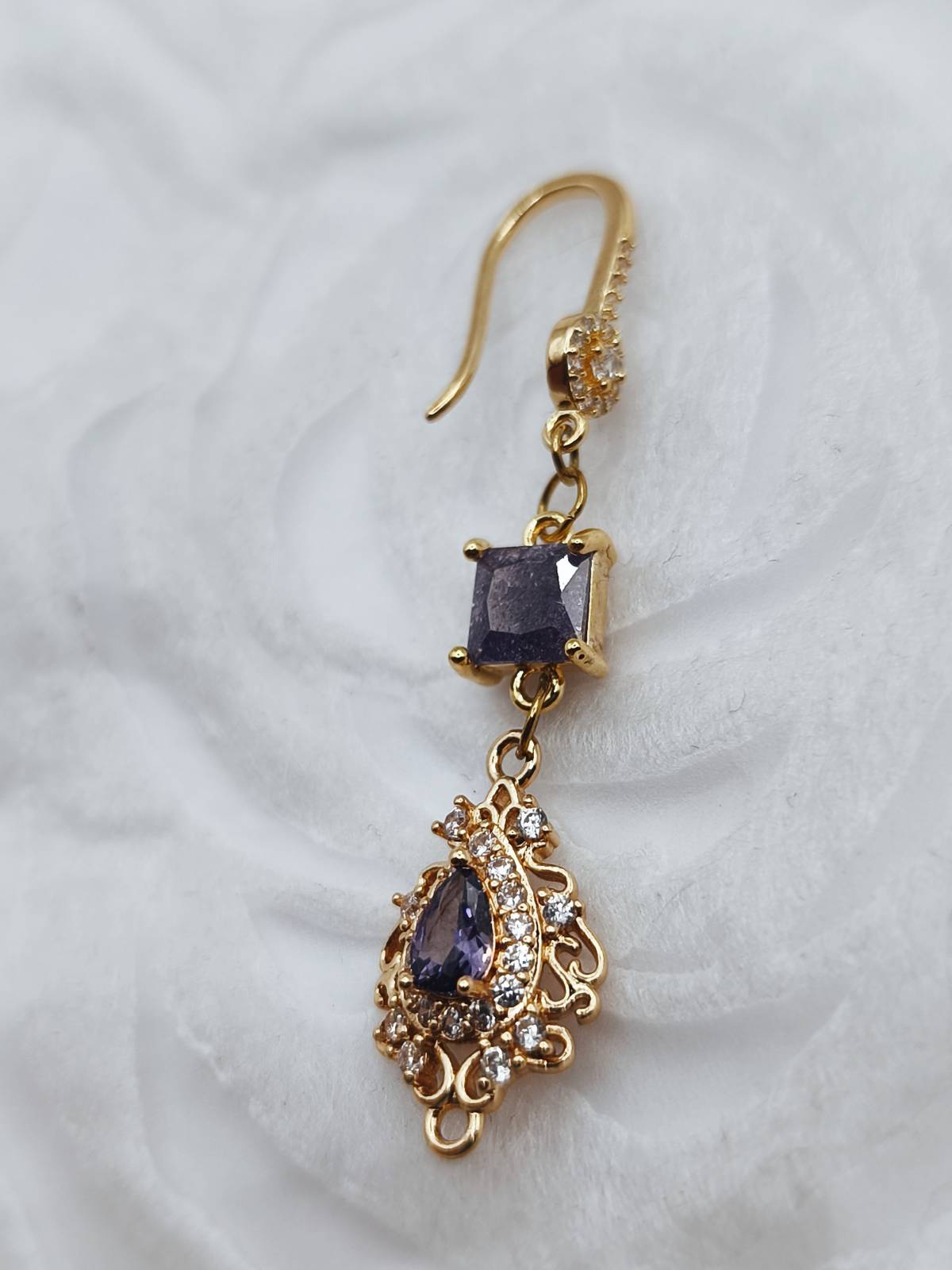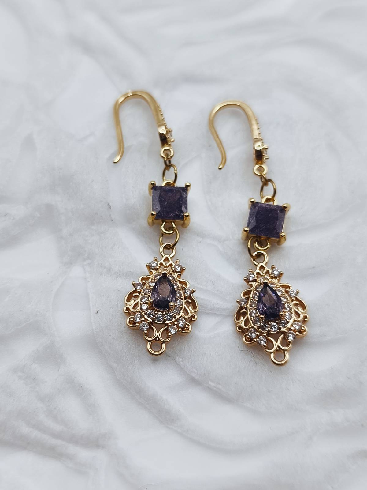 Handmade drop earrings from the Amavero collection, crafted from gold plated brass. The design blends classic and vintage elements, featuring sparkling purple cubic zirconia in square and teardrop shapes, surrounded by smaller white zircons for enhanced brilliance. A piece of jewelry that exudes regal elegance, perfect for adding a mysterious and luxurious touch to any outfit.