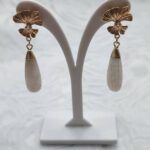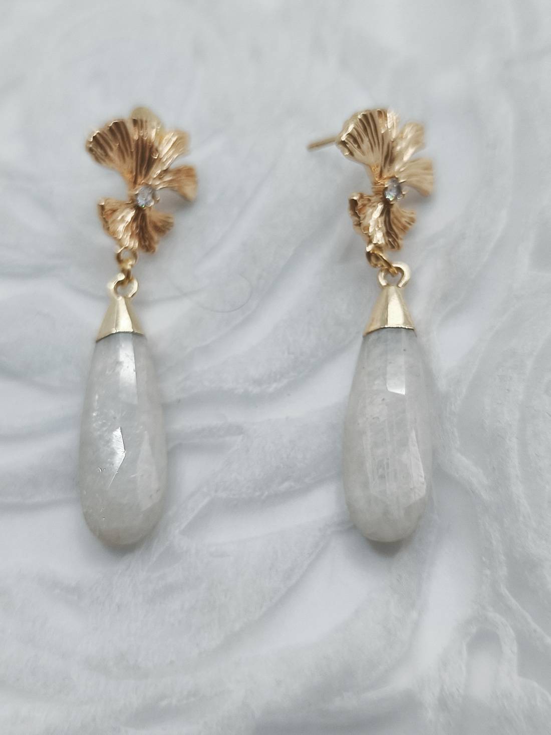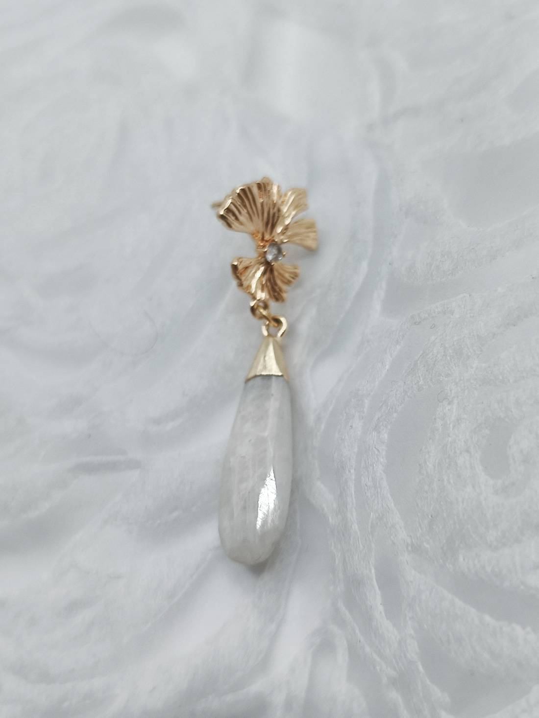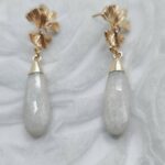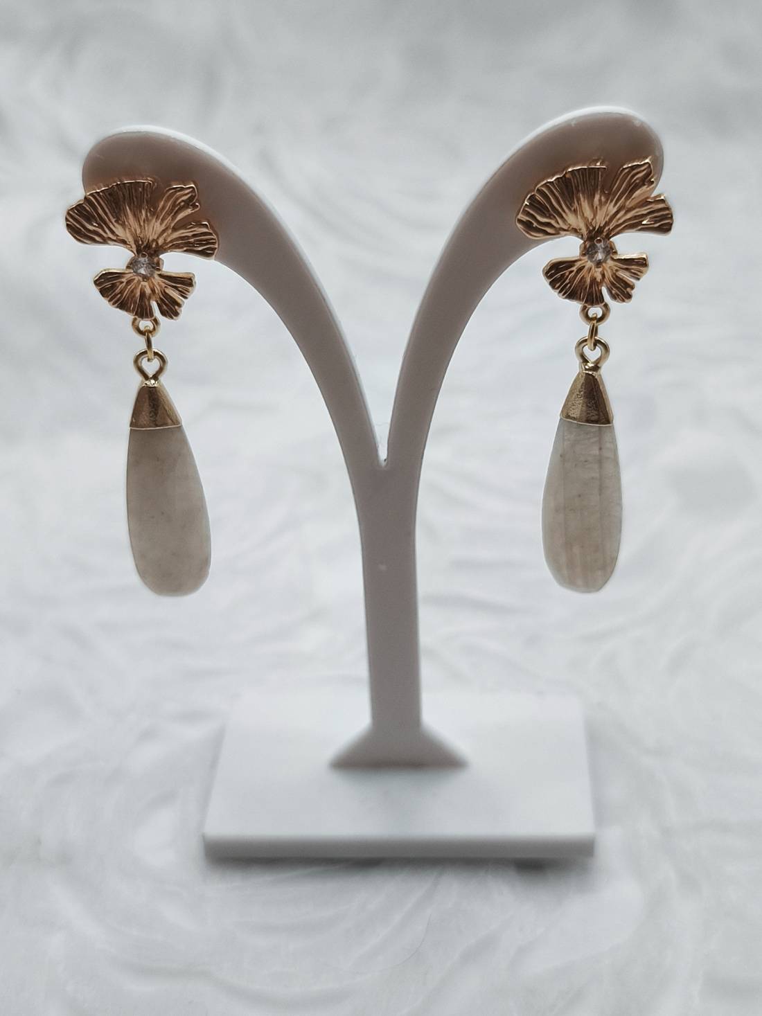 Handmade drop earrings from the Amavero collection, combining the natural elegance of white jade with the symbolic Ginkgo Biloba leaf. The elongated teardrop-shaped semi-precious stones hang from an intricate, embossed leaf-shaped base, featuring a sparkling cubic zirconia at its center. The combination of pure white with warm gold plating adds a sense of serenity and aristocratic charm, making them perfect for brightening up any look.