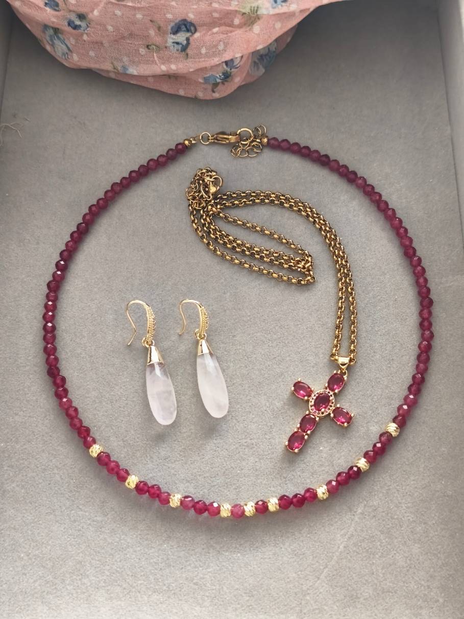 Ένας δυναμικός συνδυασμός που αποπνέει πάθος, θηλυκότητα και αριστοκρατική φινέτσα. Το combo περιλαμβάνει το χειροποίητο κολιέ “Crimson Harmony” με τους βαθυκόκκινους νεφρίτες, τον εντυπωσιακό Fuchsia σταυρό και τα χειροποίητα σκουλαρίκια από Ροζ Χαλαζία. Η αντίθεση του έντονου φούξια με το βαθύ κόκκινο και την απαλή λάμψη του χαλαζία δημιουργεί ένα layering που μαγνητίζει το βλέμμα. Ιδανικό για να δώσει ένταση σε ένα total black ή total white σύνολο, αναβαθμίζοντας κάθε σας εμφάνιση από το πρωί έως το βράδυ.