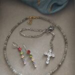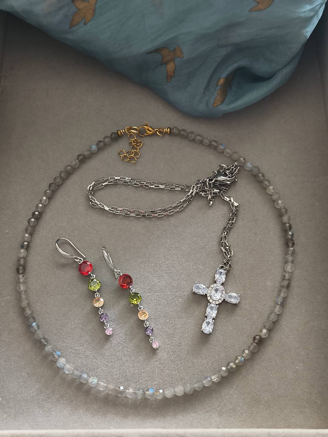 Ένας καθηλωτικός συνδυασμός που υμνεί το μυστηριώδες παιχνίδισμα του φωτός και την καθαρή λάμψη. Το combo περιλαμβάνει το χειροποίητο κολιέ “Mystic Glow” με τον πολυεδρικό λαμπραδορίτη, τον αστραφτερό σταυρό “Crystal Purity” με το λευκόχρυσο φινίρισμα και τα εντυπωσιακά μακριά πολύχρωμα σκουλαρίκια. Οι ιριδισμοί του λαμπραδορίτη δένουν αρμονικά με την κρυστάλλινη διαφάνεια του σταυρού και τις παιχνιδιάρικες αποχρώσεις των ζιργκόν, δημιουργώντας ένα layering που αποπνέει σύγχρονη κομψότητα και φινέτσα. Ιδανικό για να φωτίσει κάθε σας εμφάνιση, από το πρωί έως το βράδυ. Ταιριάζει μοναδικά με ρούχα σε τόνους του γκρι, του μπλε, του λευκού, αλλά και του μαύρου.