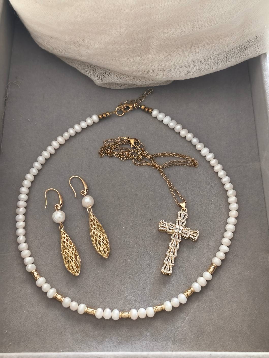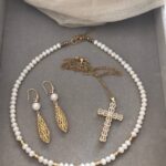 Ένα σετ που υμνεί την κλασική ομορφιά με μια σύγχρονη, πολυτελή ματιά. Το combo περιλαμβάνει το κολιέ “Golden Pearl Essence” με φυσικά μαργαριτάρια, τον επιβλητικό σταυρό “Imperial Light” με baguette κρύσταλλα και τα εντυπωσιακά κρεμαστά σκουλαρίκια με το ανάγλυφο χρυσό δάκρυ. Η απαλή λάμψη των μαργαριταριών δένει αρμονικά με τις καθαρές γραμμές των Cubic Zirconia, δημιουργώντας ένα layering που αποπνέει κύρος. Είναι η ιδανική επιλογή για μια επίσημη δεξίωση, για μια νύφη ή για να δώσετε μια αριστοκρατική νότα σε ένα αυστηρό office look. Ταιριάζει άψογα με μετάξι, σατέν και ρούχα σε τόνους του ιβουάρ, του μαύρου ή του χρυσού.
