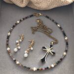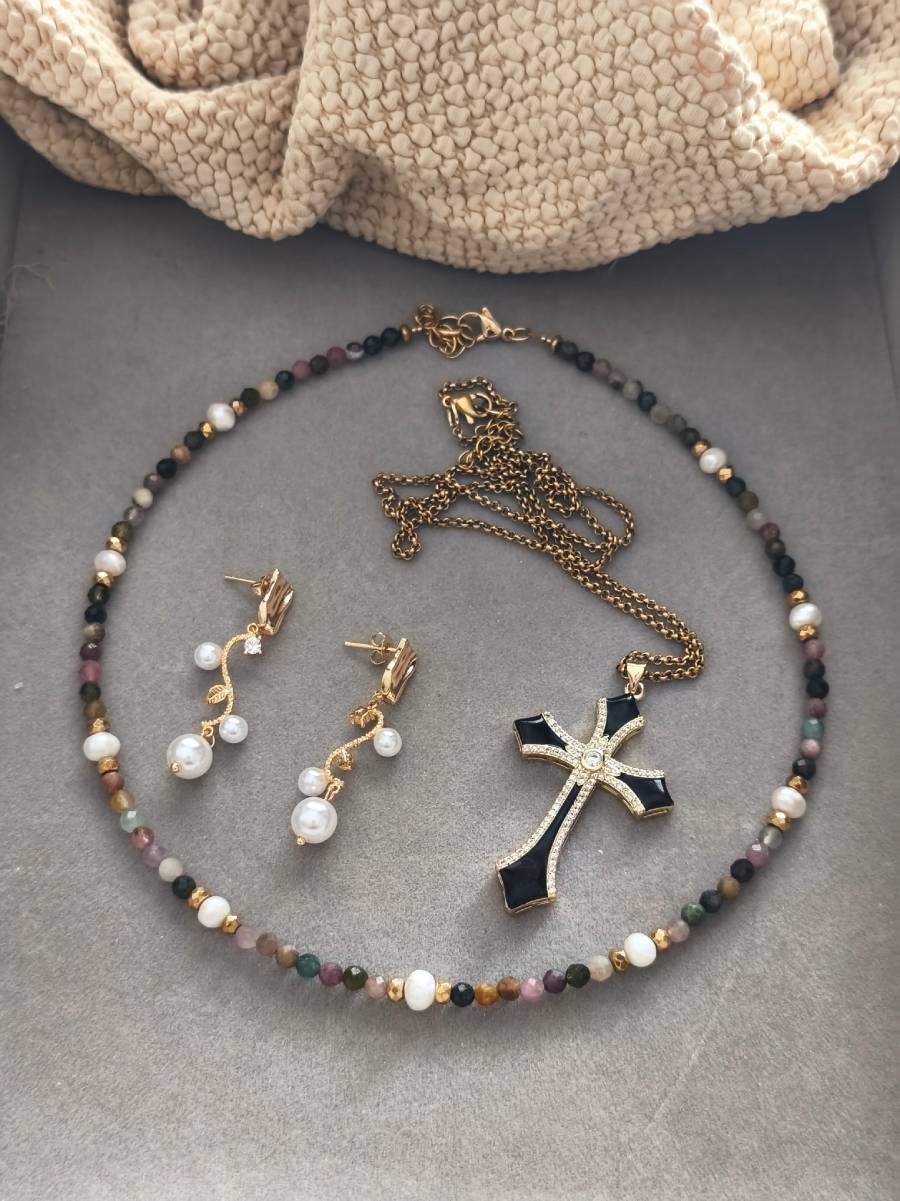 Ένας καθηλωτικός συνδυασμός που παντρεύει την αγνότητα των μαργαριταριών με το επιβλητικό μαύρο σμάλτο. Το combo περιλαμβάνει το χειροποίητο κολιέ “Positive Energy” με πολύχρωμες τουρμαλίνες και φυσικά μαργαριτάρια, τον μεγαλοπρεπή σταυρό “Grand Enamel Cross” και τα κομψά κρεμαστά σκουλαρίκια με το σχέδιο κλαδί. Η βαθιά λάμψη του μαύρου σμάλτου σε συνδυασμό με τα ζιργκόν δημιουργεί μια αίσθηση αρχοντιάς, ενώ οι γήινες αποχρώσεις των λίθων εξισορροπούν το σύνολο με φινέτσα. Ιδανικό για να αναβαθμίσει ένα κλασικό office look ή για να πρωταγωνιστήσει σε μια επίσημη βραδινή εμφάνιση. Ταιριάζει μοναδικά με ρούχα σε τόνους του ιβουάρ, του μαύρου, του μπεζ και του χρυσού.