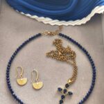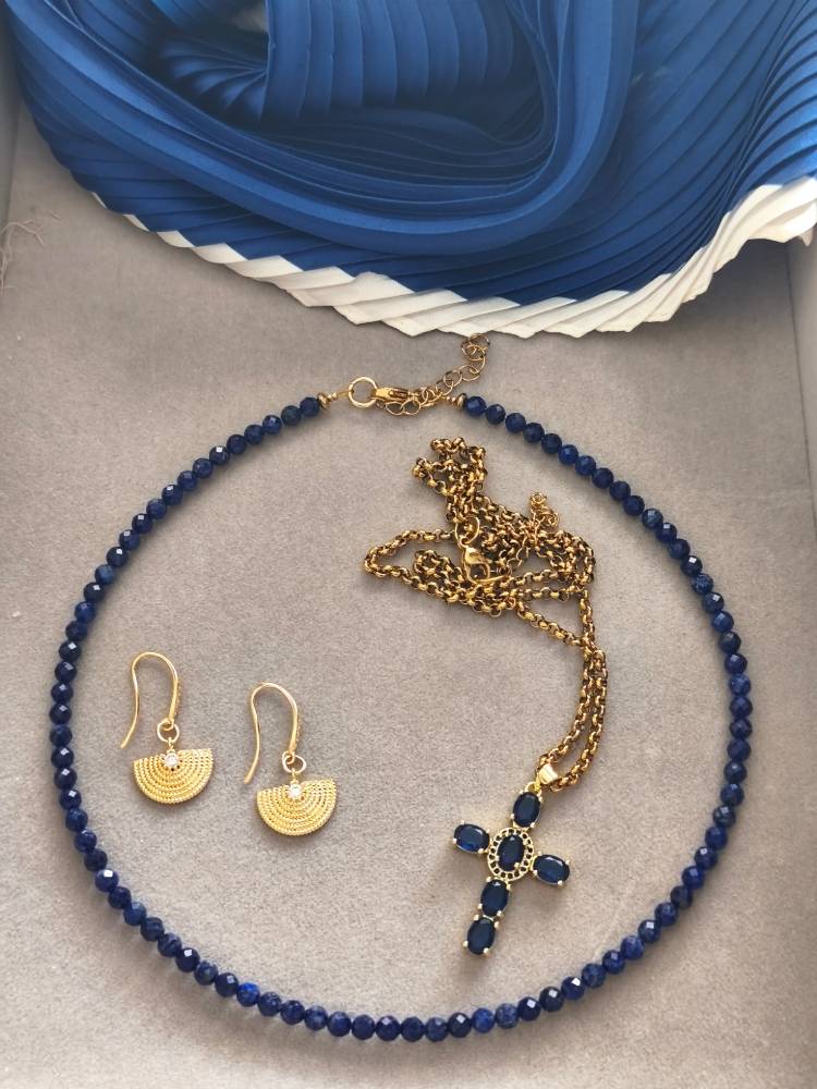 Ένας αριστοκρατικός συνδυασμός που αποπνέει γαλήνη και διαχρονική πολυτέλεια. Το combo περιλαμβάνει το χειροποίητο κολιέ με ημιπολύτιμους λίθους Λάπις Λάζουλι (Lapis Lazuli), τον επιβλητικό σταυρό “Sapphire Grace” και τα περίτεχνα σκουλαρίκια “Βεντάλια” με λευκά ζιργκόν. Οι βαθιές, έντονες μπλε αποχρώσεις των λίθων δένουν αρμονικά με τη λάμψη των ζαφειρένιων Cubic Zirconia, δημιουργώντας ένα layering που μαγνητίζει το βλέμμα. Ιδανικό για να συνοδεύσει μια επίσημη εμφάνιση ή για να δώσει μια πνοή αρχοντιάς σε ένα απλό λευκό πουκάμισο. Ταιριάζει μοναδικά με ρούχα σε τόνους του λευκού, του γαλάζιου, του χρυσού, αλλά και του κλασικού μπλε navy.