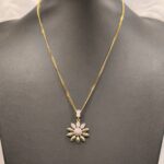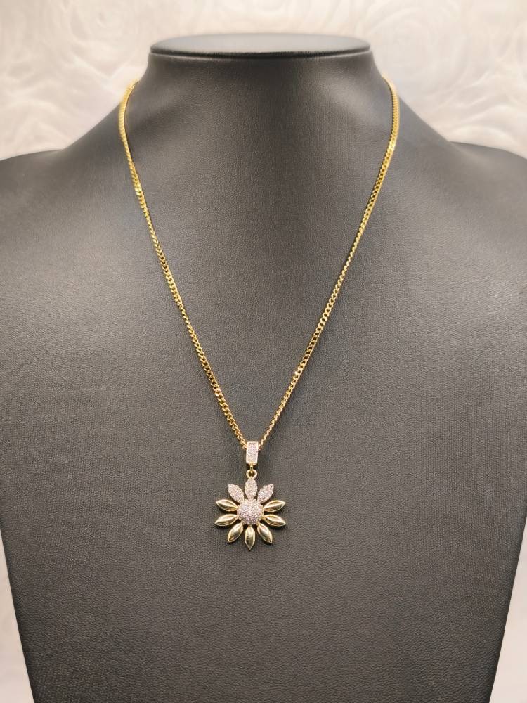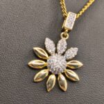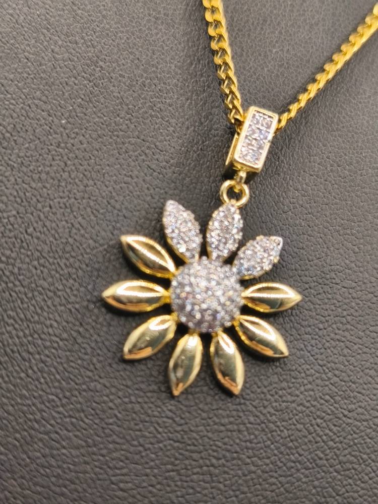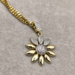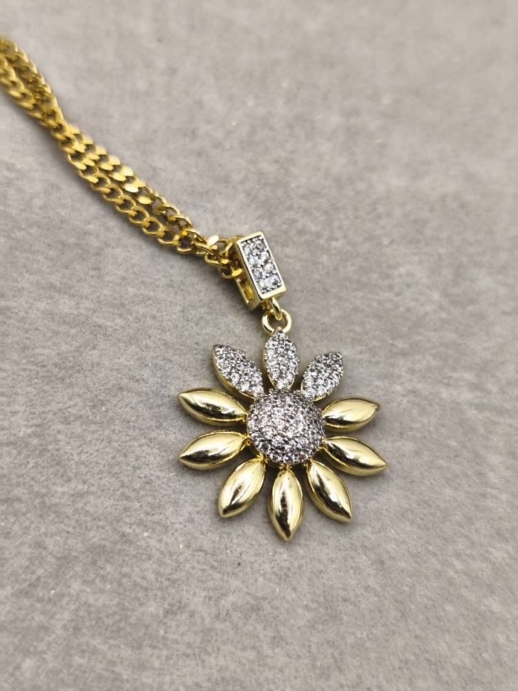 Ένα κόσμημα που εξυμνεί τη θηλυκότητα και τη λάμψη της φύσης! Αυτό το επιβλητικό κολιέ διαθέτει ένα μενταγιόν σε σχήμα λουλουδιού, φιλοτεχνημένο από επιχρυσωμένο ορείχαλκο 18Κ. Η μοναδικότητά του έγκειται στην αντίθεση των πετάλων: η εναλλαγή ανάμεσα στις λείες χρυσές επιφάνειες και εκείνες που είναι κατάσπαρτες με αστραφτερά κρύσταλλα ζιργκόν δημιουργεί ένα πολυδιάστατο αποτέλεσμα που ακτινοβολεί σε κάθε κίνηση. Λόγω του εκλεπτυσμένου σχεδιασμού του, είναι το ιδανικό κεντρικό κομμάτι για το layering σας, ταιριάζοντας απόλυτα με τα κοντά κολιέ της AMAVERO από μικρούς ημιπολύτιμους λίθους.