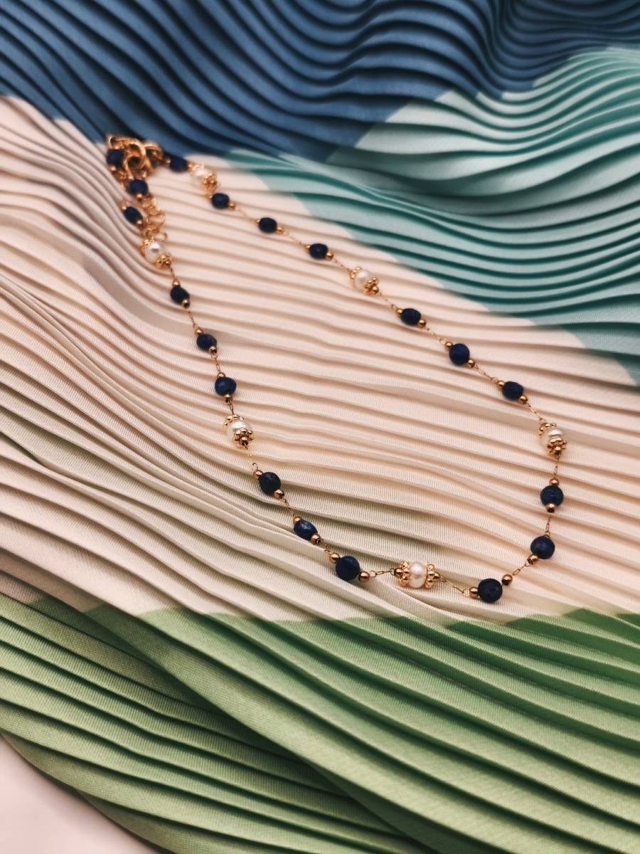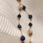 Ροζάριο από ημιπολύτιμους λίθους λάπις λάζουλι στο χαρακτηριστικό βαθύ μπλε του χρώμα, σε συνδυασμό με φυσικά μαργαριτάρια καλλιέργειας. Ένα κόσμημα που αποπνέει αριστοκρατική κομψότητα και γαλήνη, θυμίζοντας τον έναστρο νυχτερινό ουρανό. Ο ντελικάτος σχεδιασμός του το καθιστά ιδανικό για layering αλλά και ως ένα υπέροχο, διαχρονικό κόσμημα για τις μικρές μας πριγκίπισσες. Ανακαλύψτε και τα υπόλοιπα κοσμήματα με λάπις λάζουλι από τη συλλογή της Amavero και αφήστε τη γοητεία τους να σας παρασύρει!