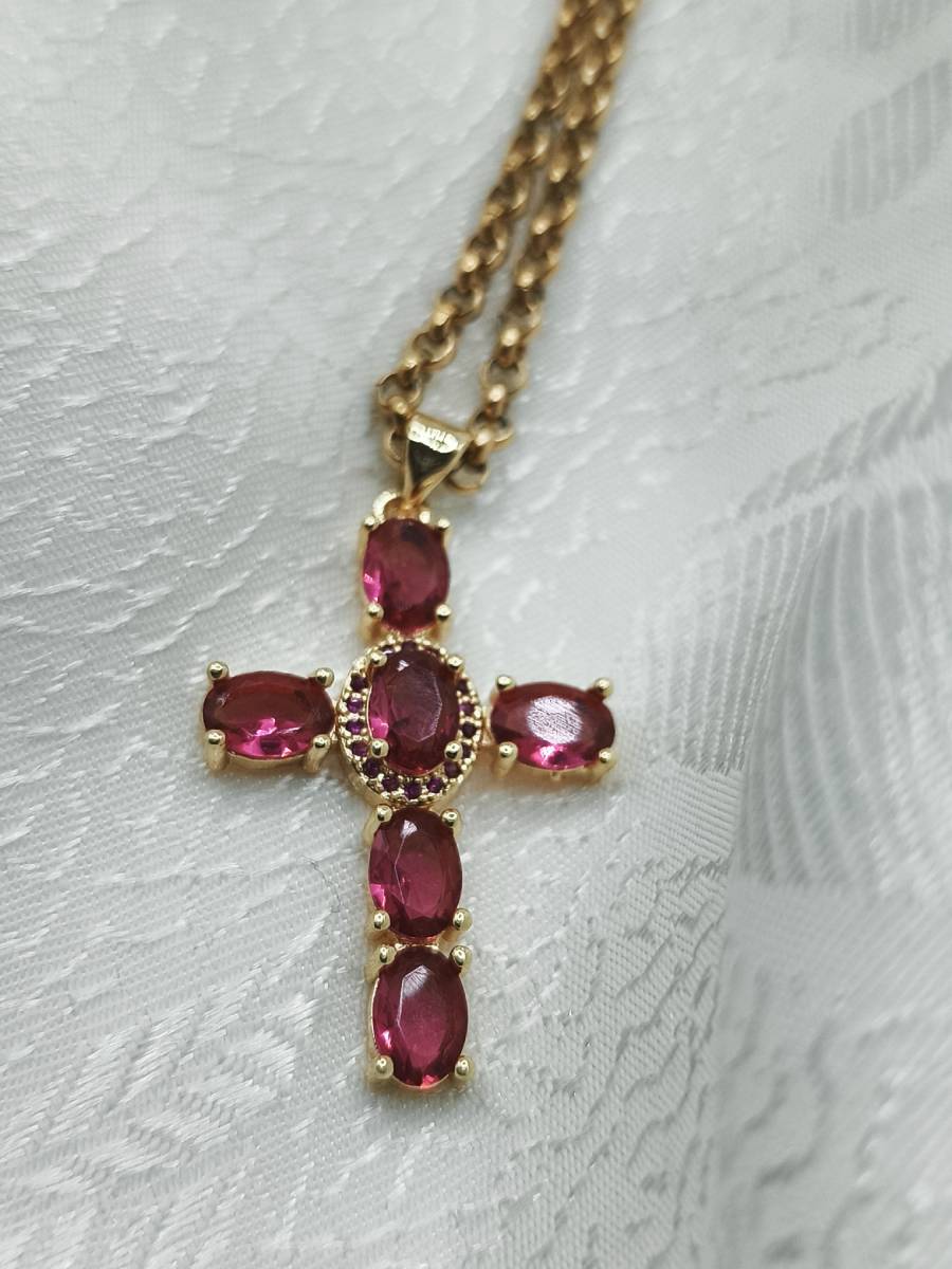 Χειροποίητο κολιέ με ατσάλινη αλυσίδα και εντυπωσιακό σταυρό από ορείχαλκο με χρυσή επιμετάλλωση. Ο σταυρός είναι περίτεχνα διακοσμημένος με κομμάτια κρυστάλλου σε έντονο ροζ χρώμα, δημιουργώντας μια αίσθηση ζωντάνιας και μοντέρνου στυλ. Ένας τολμηρός και κομψός συνδυασμός από τη συλλογή της AMAVERO που παντρεύει τη διαχρονική γοητεία με το σύγχρονο design. Ιδανικό για να προσθέσει χρώμα και προσωπικότητα σε κάθε σας εμφάνιση.