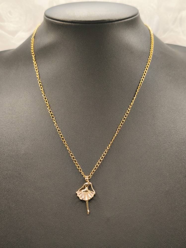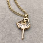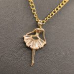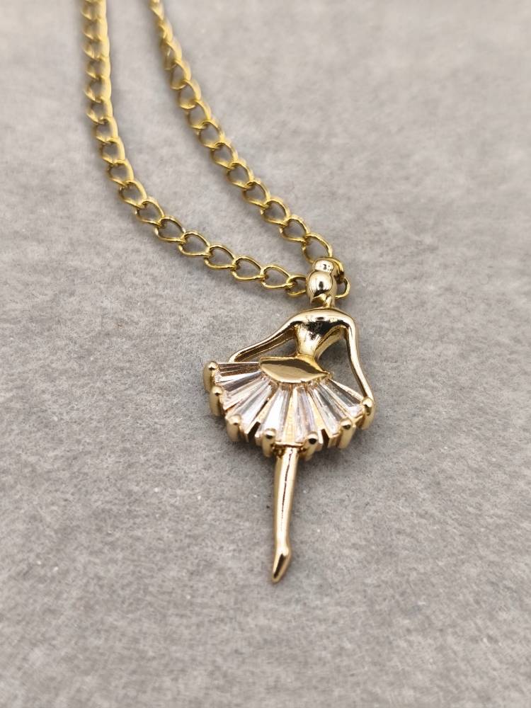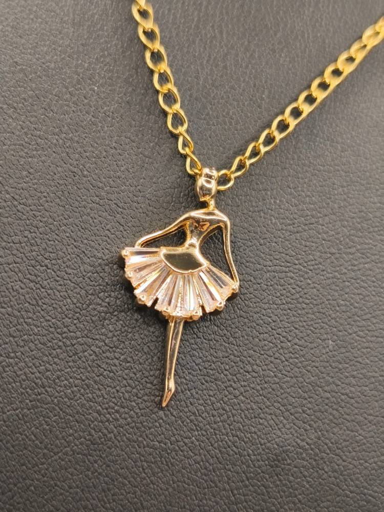 Ένα κόσμημα βγαλμένο από παραμύθι! Αυτό το ντελικάτο κολιέ διαθέτει ένα μενταγιόν σε σχήμα μπαλαρίνας, φιλοτεχνημένο από επιχρυσωμένο ορείχαλκο . Η tutu (φούστα) της μπαλαρίνας είναι στολισμένη με αστραφτερά κρύσταλλα ζιργκόν σε κοπή baguette, προσφέροντας μια μοναδική λάμψη σε κάθε κίνηση. Είναι το ιδανικό δώρο για κάθε «μικρή πριγκίπισσα» που ονειρεύεται τον κόσμο του χορού, αλλά και για κάθε γυναίκα που θέλει να προσθέσει μια νότα ρομαντισμού και χάρης στο στυλ της.