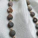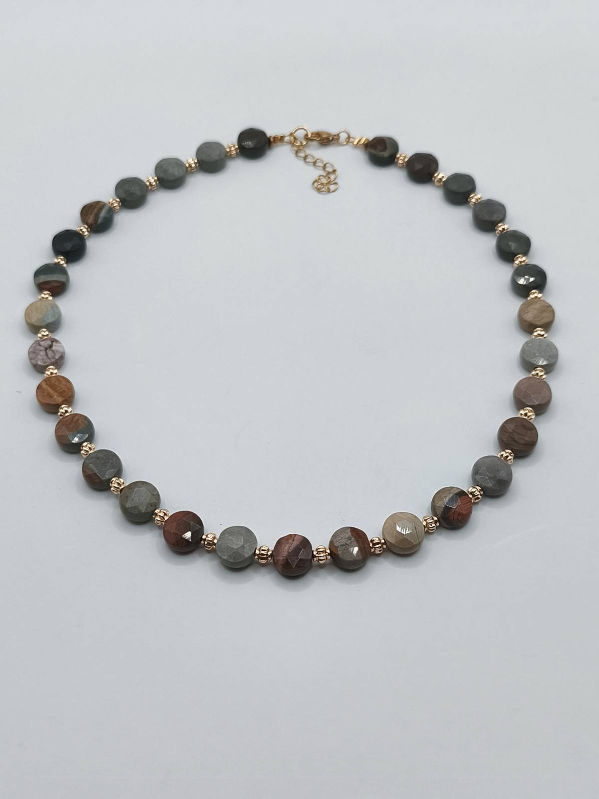 Χειροποίητο κολιέ από ημιπολύτιμους λίθους ίασπι picture (picture jasper) σε στρογγυλή πλακέ μορφή, με πολλά πολυεδρικά κοψίματα στον λίθο που του δίνουν επιπλέον μοναδικότητα. Ανάμεσα σε κάθε λίθο, στοιχεία ορείχαλκου με χρυσή επιμετάλλωση προσθέτουν λάμψη και γοητεία στο σύνολο. Είναι ένα κόσμημα που θα προσθέσει κύρος στην εμφάνισή σας και θα αναβαθμίσει το ντύσιμό σας!