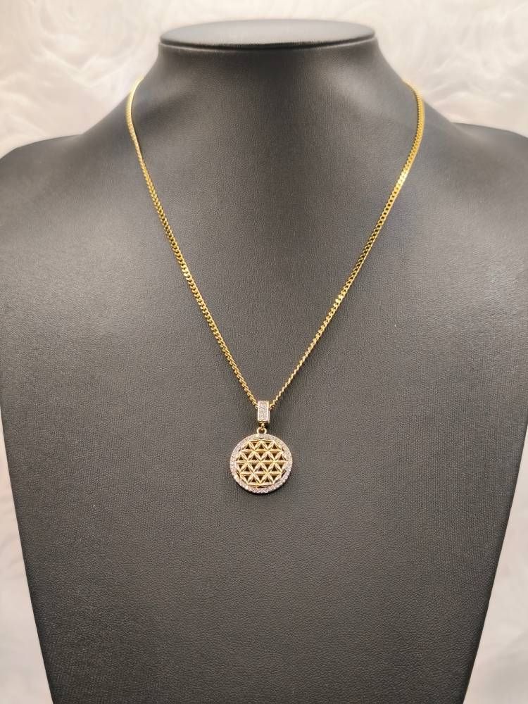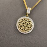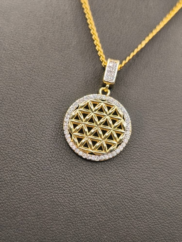 Ένα κόσμημα που αποπνέει αριστοκρατική φινέτσα και σύγχρονο design! Αυτό το επιβλητικό κολιέ διαθέτει ένα κυκλικό μενταγιόν με περίτεχνη γεωμετρική πλέξη στο εσωτερικό του, φιλοτεχνημένο από επιχρυσωμένο ορείχαλκο 18Κ. Η λάμψη του ενισχύεται από το περιμετρικό στεφάνι με αστραφτερά κρύσταλλα ζιργκόν, ενώ ο στολισμένος κρίκος (bail) προσθέτει μια επιπλέον δόση πολυτέλειας. Λόγω του statement χαρακτήρα του, αποτελεί την ιδανική βάση για το layering σας, προσφέροντας μια αίσθηση διαχρονικής κομψότητας σε κάθε σας εμφάνιση.