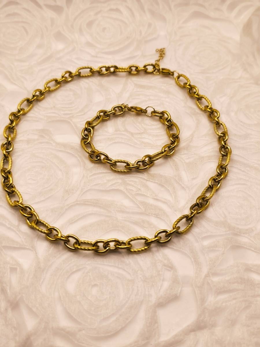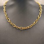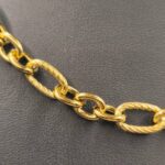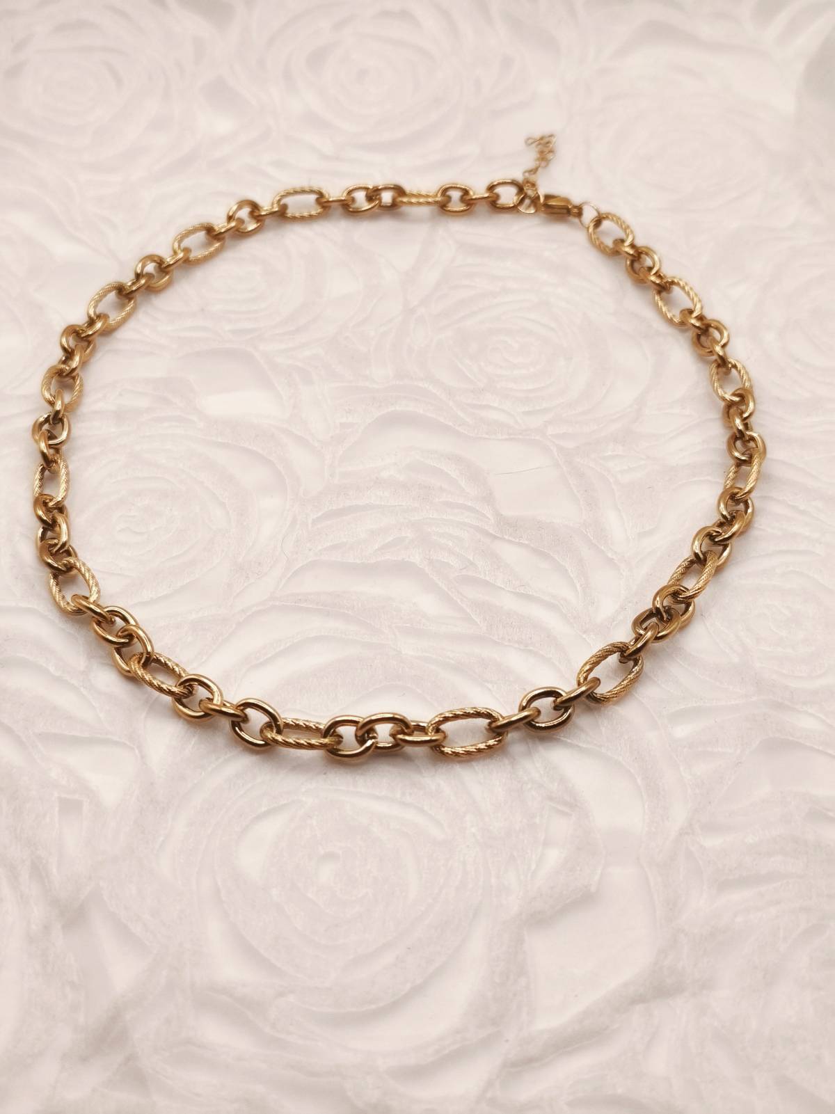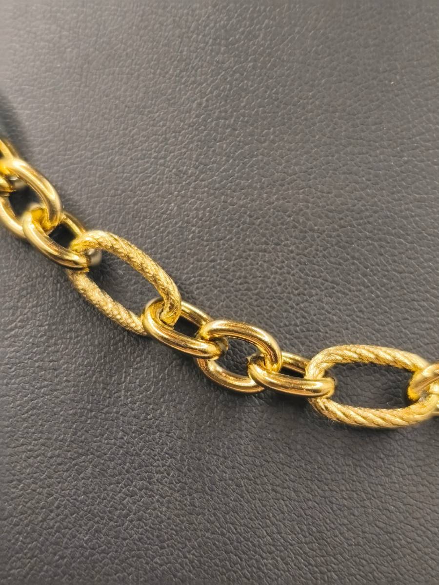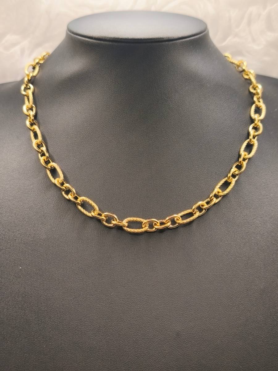 Ένα εντυπωσιακό χειροποίητο κολιέ που επαναπροσδιορίζει την κλασική αλυσίδα με έναν σύγχρονο, ανάγλυφο σχεδιασμό. Οι οβάλ κρίκοι (Oval Links) διαθέτουν μια μοναδική υφή που αντανακλά το φως, προσφέροντας βάθος και χαρακτήρα σε κάθε σας εμφάνιση. Κατασκευασμένο από υψηλής ποιότητας ανοξείδωτο ατσάλι με πραγματική επιχρύσωση 18Κ, αυτό το κόσμημα της AMAVERO αποτελεί την ιδανική επιλογή για “statement layering” ή για να φορεθεί μόνο του ως το κεντρικό κομμάτι του συνόλου σας. Αναζητήστε και το αντίστοιχο βραχιόλι για να δημιουργήσετε ένα ολοκληρωμένο και απόλυτα κομψό σετ!