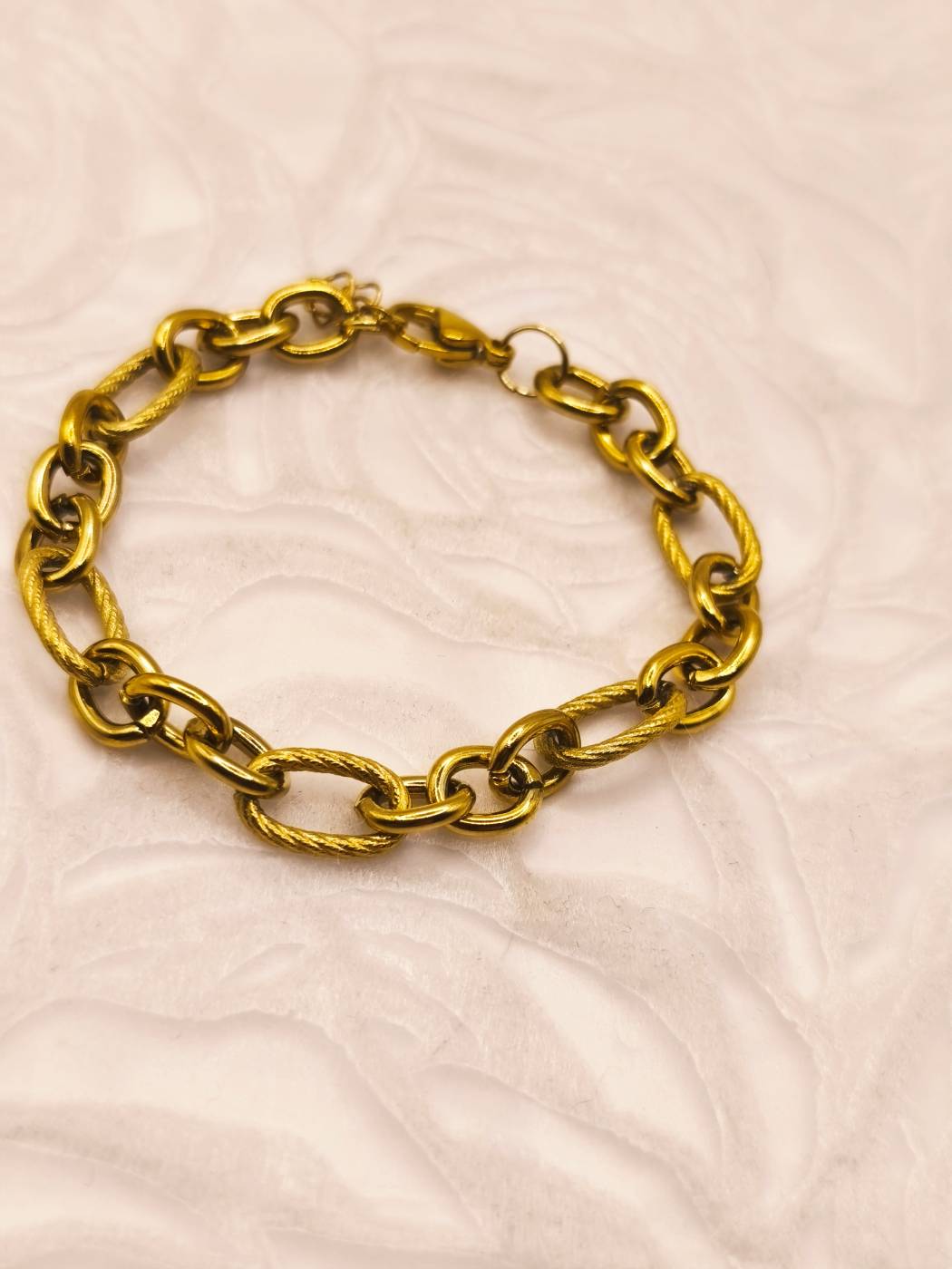 Το απόλυτο αξεσουάρ για να ολοκληρώσετε το σύνολό σας! Αυτό το χειροποίητο βραχιόλι με ανάγλυφους οβάλ κρίκους (Oval Links) συνδυάζει την κλασική γοητεία της αλυσίδας με μια μοντέρνα, “textured” αισθητική που αιχμαλωτίζει το φως. Κατασκευασμένο από ανθεκτικό ανοξείδωτο ατσάλι με πραγματική επιχρύσωση 18Κ, προσφέρει τη λάμψη και την πολυτέλεια του χρυσού με μεγάλη αντοχή στον χρόνο. Φορέστε το μόνο του για μια chic εμφάνιση ή συνδυάστε το με το αντίστοιχο κολιέ της συλλογής AMAVERO για ένα εντυπωσιακό και απόλυτα εναρμονισμένο σετ!