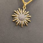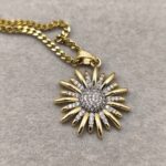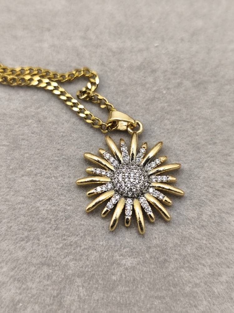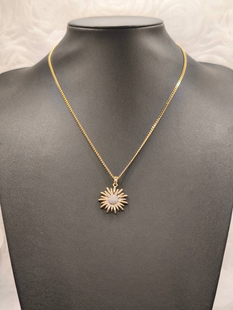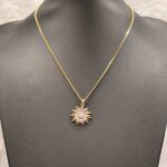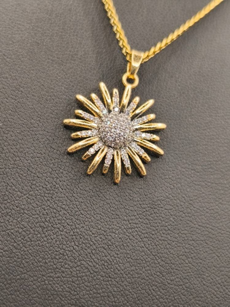 Ένα κόσμημα που ακτινοβολεί το φως και τη ζεστασιά του ήλιου! Αυτό το επιβλητικό κολιέ διαθέτει ένα μενταγιόν σε σχήμα ηλιοτρόπιου (sunflower), με την καρδιά του λουλουδιού να είναι κατάσπαρτη από αστραφτερά κρύσταλλα ζιργκόν. Ο σχεδιασμός με τα πυκνά χρυσά πέταλα που περιβάλλουν το λαμπερό κέντρο δημιουργεί ένα εντυπωσιακό αποτέλεσμα που αποπνέει αισιοδοξία και φινέτσα. Ιδανικό για να αποτελέσει το κεντρικό κομμάτι του layering σας, προσθέτοντας μια νότα λάμψης σε κάθε σας εμφάνιση.