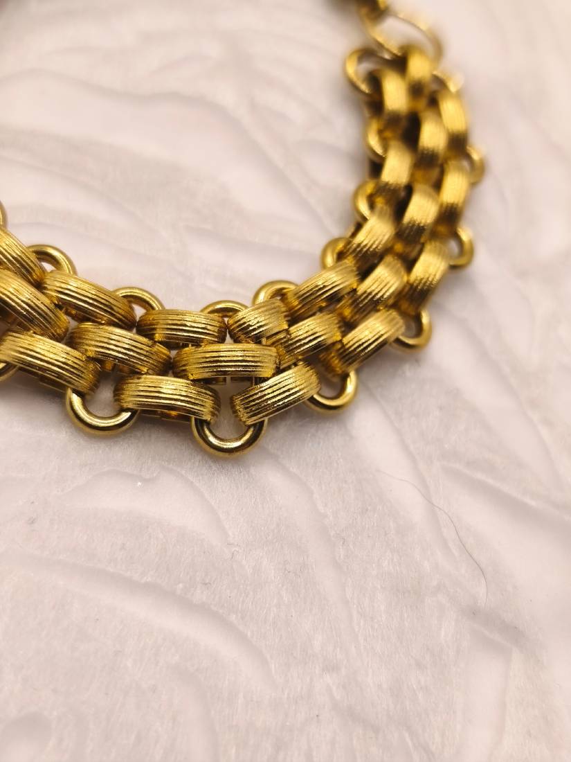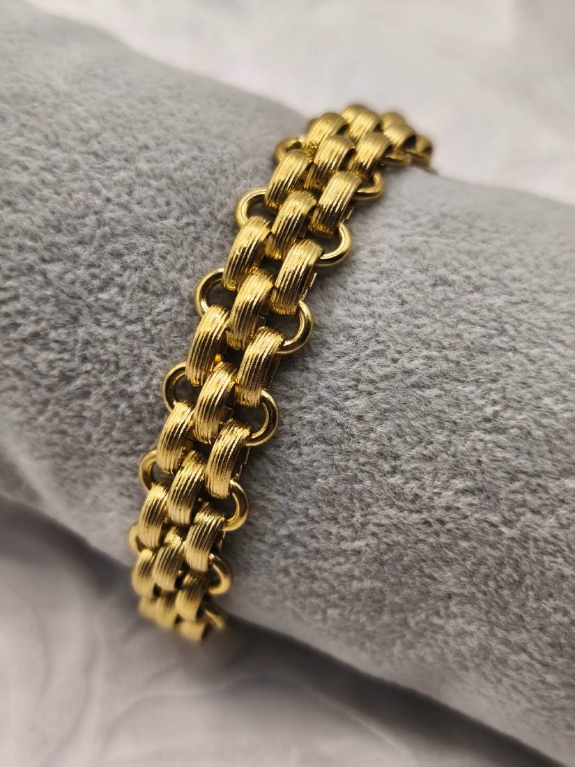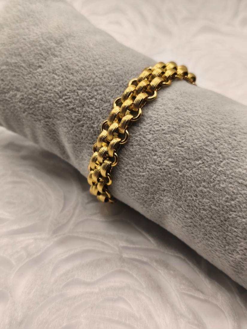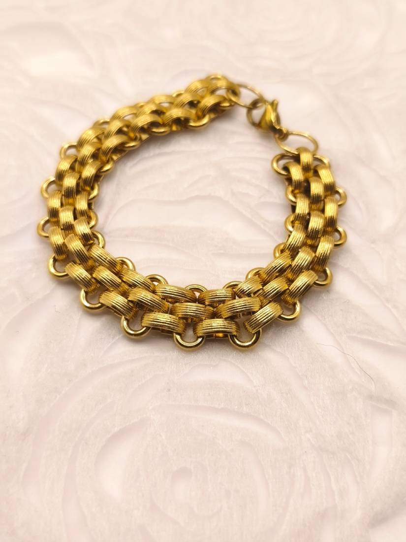 Ένα κόσμημα που πραγματικά «στολίζει» τον καρπό! Αυτό το χειροποίητο βραχιόλι ξεχωρίζει για την περίτεχνη, τριπλή του πλέξη από ανάγλυφους κρίκους που δημιουργούν ένα πλούσιο και επιβλητικό αποτέλεσμα. Κατασκευασμένο από υψηλής ποιότητας ανοξείδωτο ατσάλι, συνδυάζει τη διαχρονική χρυσή λάμψη με την εξαιρετική αντοχή στην καθημερινή χρήση. Ο μοναδικός του σχεδιασμός προσδίδει μια αίσθηση πολυτέλειας και δυναμισμού, καθιστώντας το την ιδανική επιλογή για να αναβαθμίσετε κάθε σας εμφάνιση, από το πρωί έως το βράδυ. Ένα statement κομμάτι της AMAVERO που δεν θα θέλετε να αποχωριστείτε!