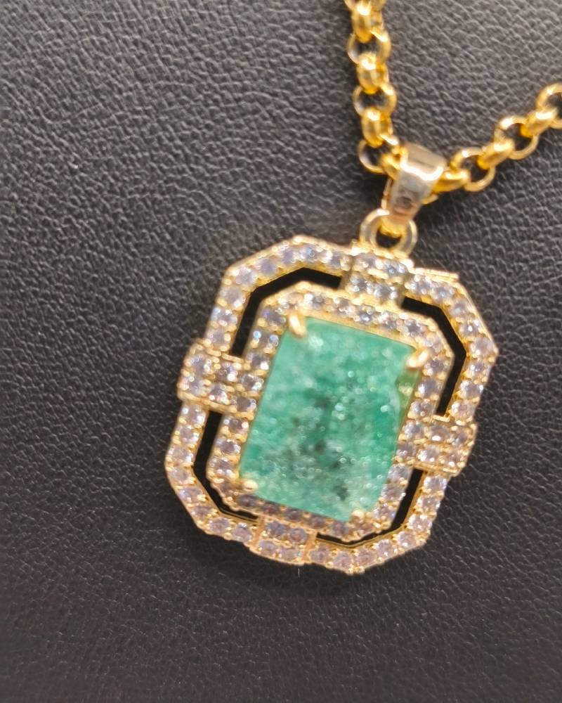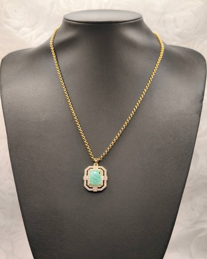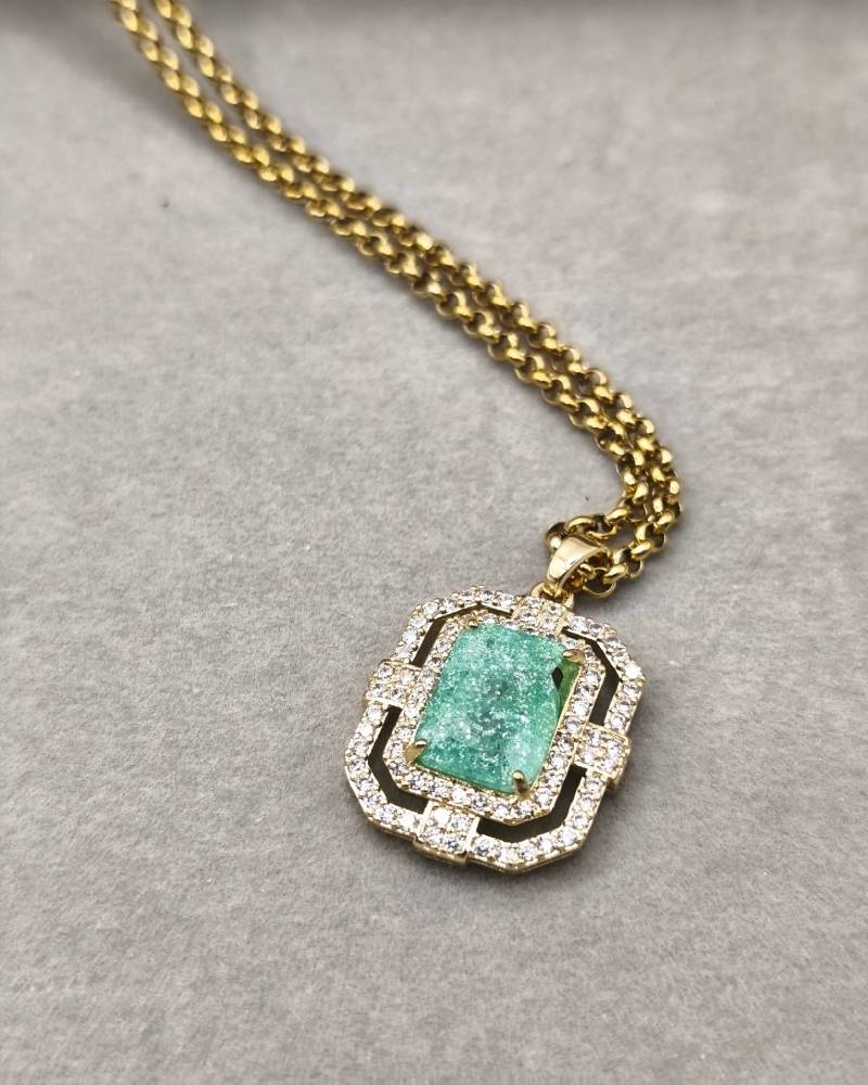 Αυτό το επιβλητικό χειροποίητο κολιέ διαθέτει ένα εντυπωσιακό κεντρικό κρύσταλλο ζιργκόν σε ανοιχτή πράσινη απόχρωση, το οποίο περιβάλλεται από μια διπλή σειρά μικρότερων διάφανων ζιργκόν για ασύγκριτη λάμψη. Ο γεωμετρικός σχεδιασμός του μενταγιόν προσδίδει μια αριστοκρατική γοητεία, ενώ είναι ιδανικό για “layering” με άλλες αλυσίδες της συλλογής μας για ένα πιο σύγχρονο look. Ανακαλύψτε το ίδιο σχέδιο σε τρεις υπέροχες αποχρώσεις —ανοιχτό πράσινο, ροζ και ανοιχτό λιλά— και βρείτε αυτή που θα φωτίσει το δικό σας στυλ!