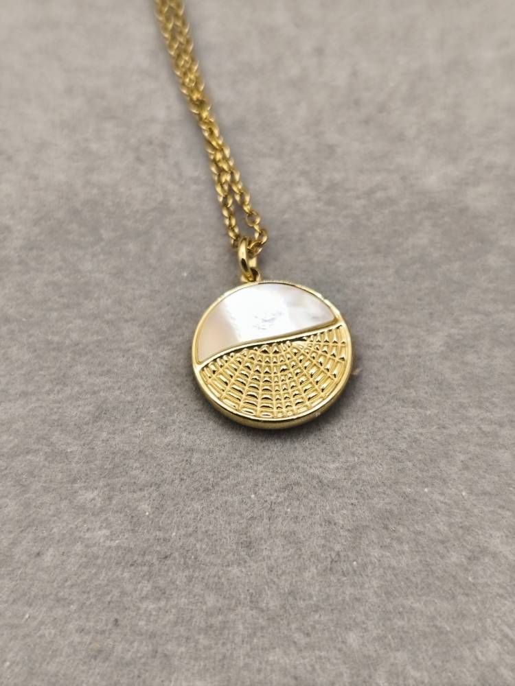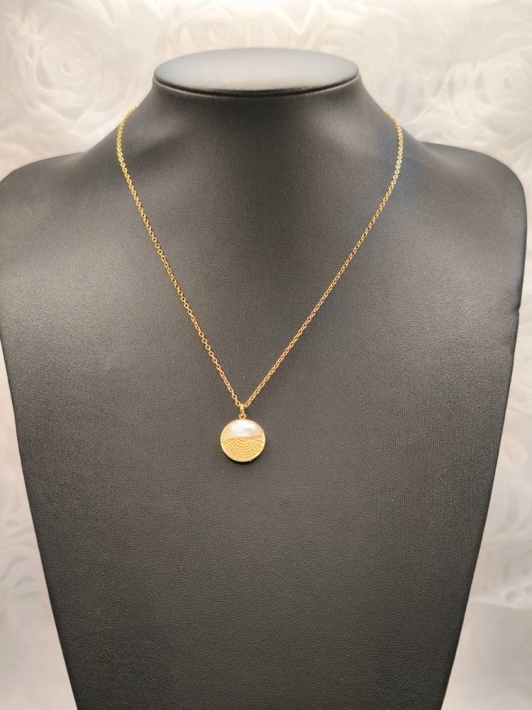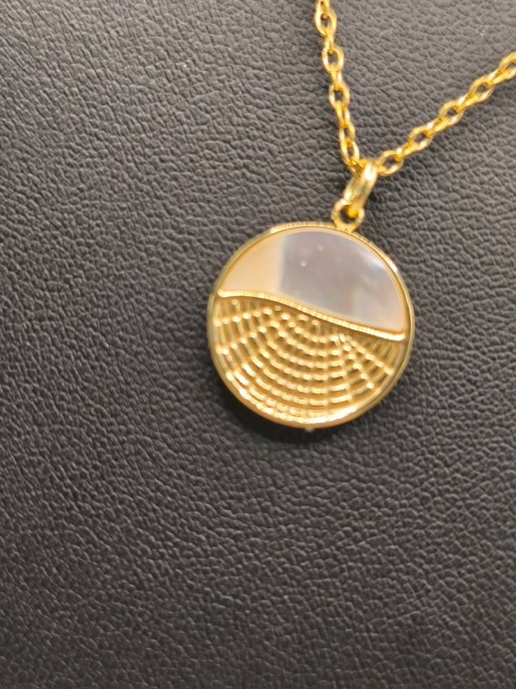 Ένα ντελικάτο κόσμημα που υμνεί την απόλυτη αρμονία και τη φυσική λάμψη! Αυτό το κομψό κολιέ διαθέτει ένα στρογγυλό μενταγιόν από φυσικό λευκό φίλντισι (shell), το οποίο αντανακλά το φως με έναν μοναδικό, ιριδίζοντα τρόπο. Η μίνιμαλ αισθητική του και ο διαχρονικός κυκλικός σχεδιασμός του το καθιστούν το ιδανικό αξεσουάρ για καθημερινή χρήση, προσφέροντας μια νότα φρεσκάδας και διακριτικής πολυτέλειας σε κάθε σας εμφάνιση. Είναι σχεδιασμένο για να φορεθεί μόνο του ή σε layering με άλλα αγαπημένα κολιέ της συλλογής AMAVERO.