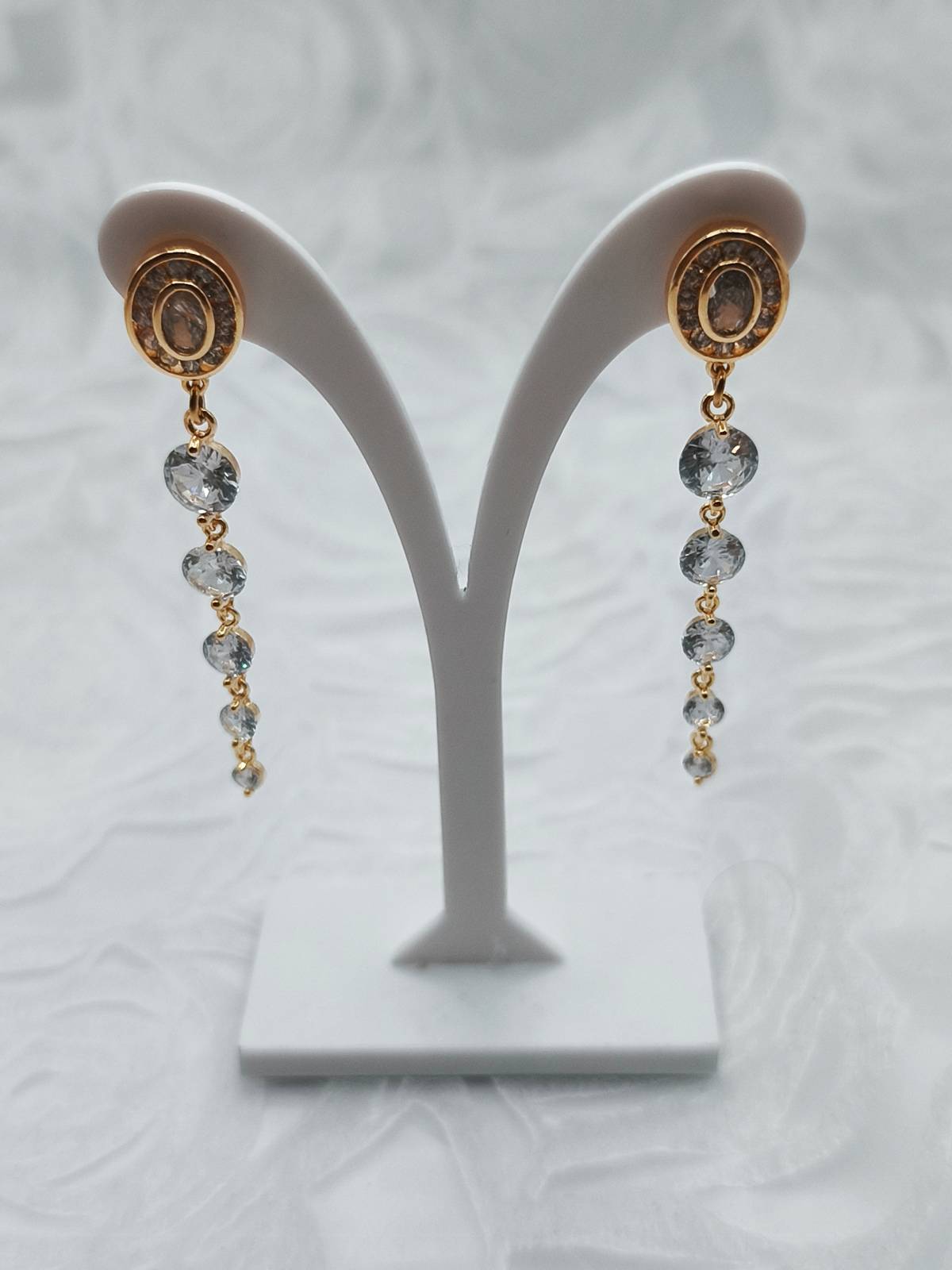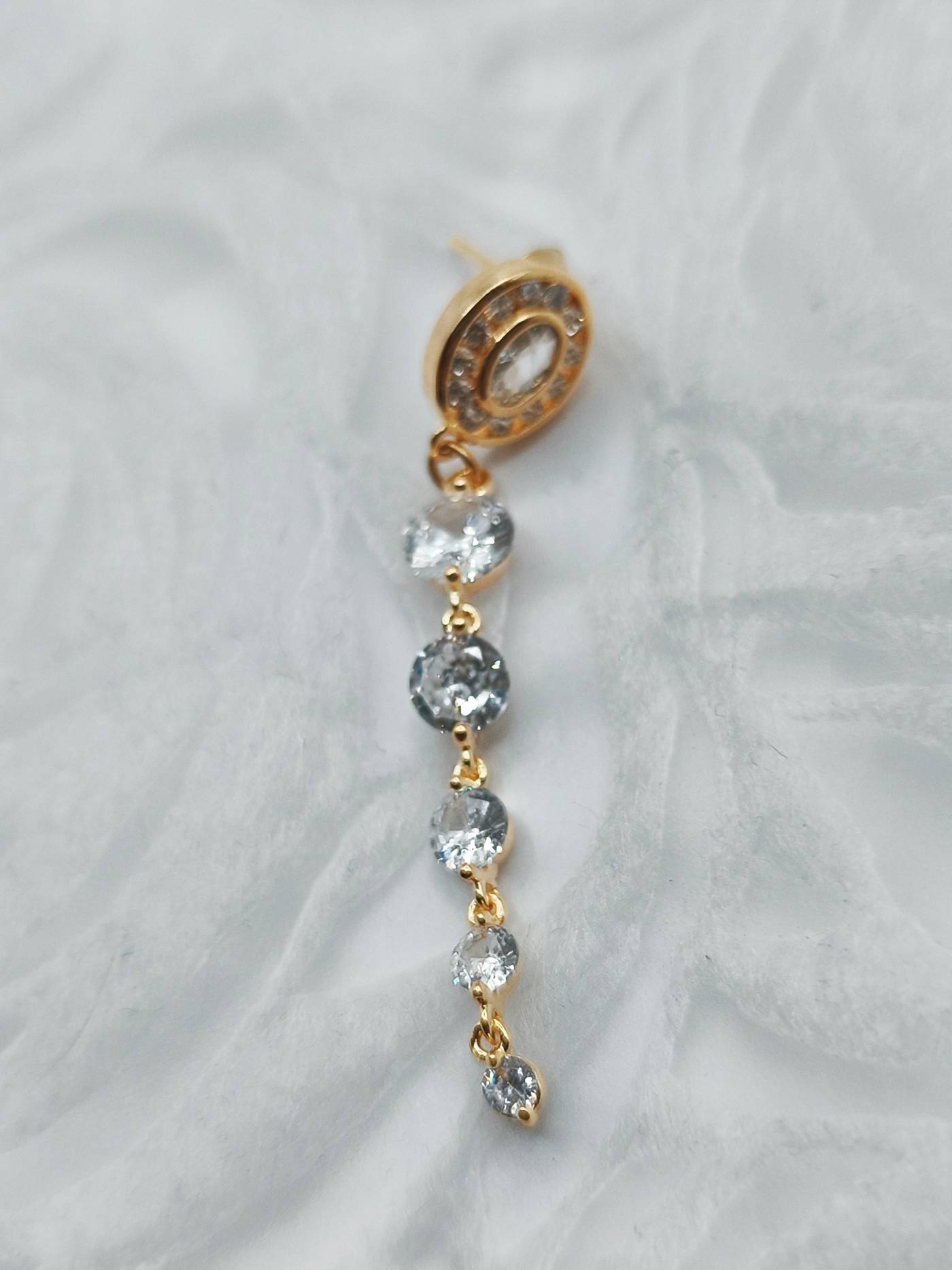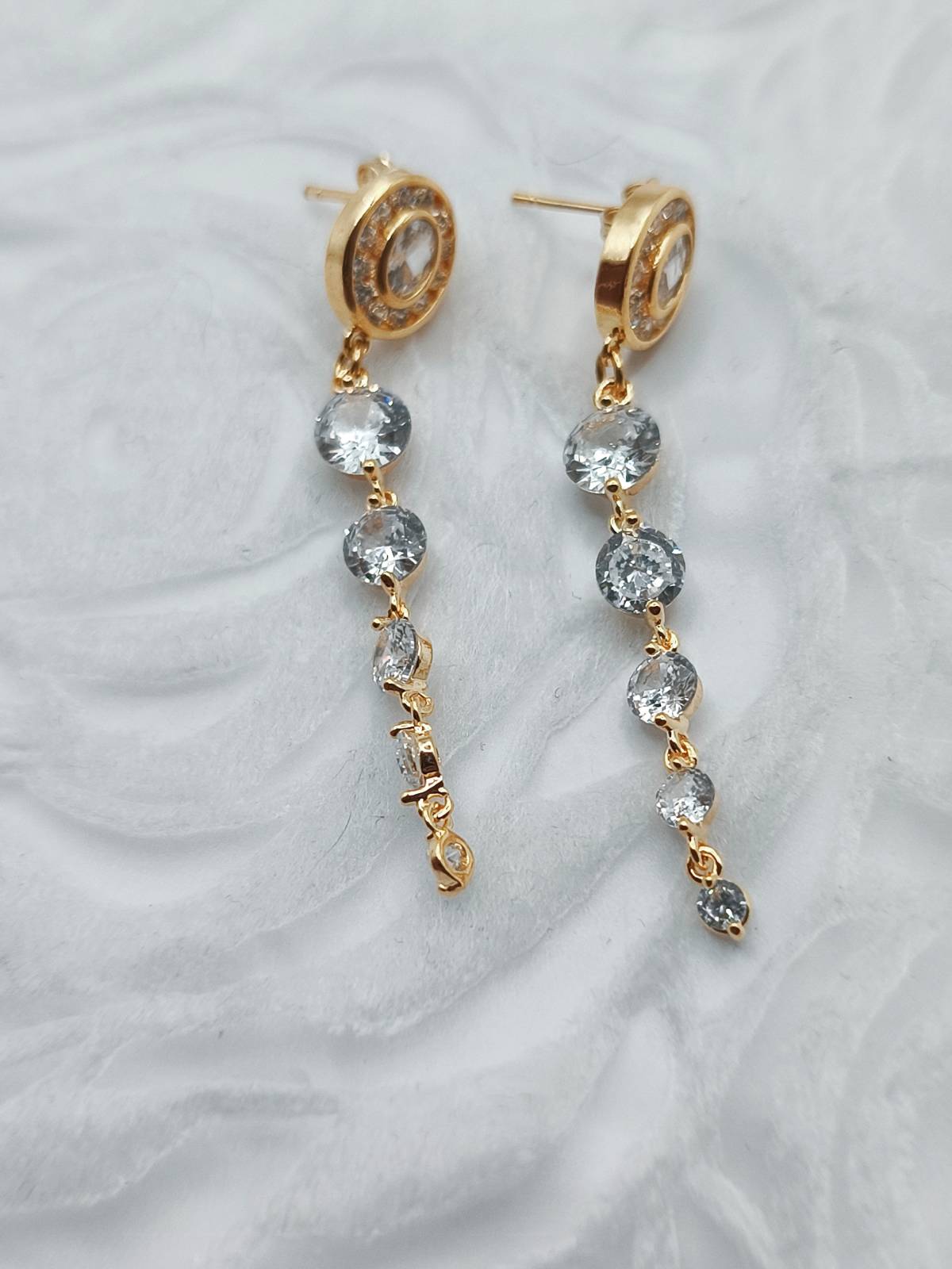 Εντυπωσιακά μακριά σκουλαρίκια που συνδυάζουν την κλασική πολυτέλεια με τη μοντέρνα αισθητική. Το σχέδιο ξεκινά με μια στρογγυλή βάση στολισμένη με μικροσκοπικά ζιργκόν, από την οποία κρέμεται μια εκθαμβωτική σειρά από πέντε στρογγυλά ζιργκόν σε διαβαθμισμένα μεγέθη. Η κίνησή τους αντανακλά το φως με κάθε σας βήμα, καθιστώντας τα μια εξαιρετική επιλογή για νυφικό κόσμημα ή για να φωτίσουν μια επίσημη βραδινή σας έξοδο. Είναι το αξεσουάρ που σας βγάζει από το δίλημμα της επιλογής, καθώς προσδίδει άμεσα μια αίσθηση λάμψης και κομψότητας.