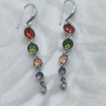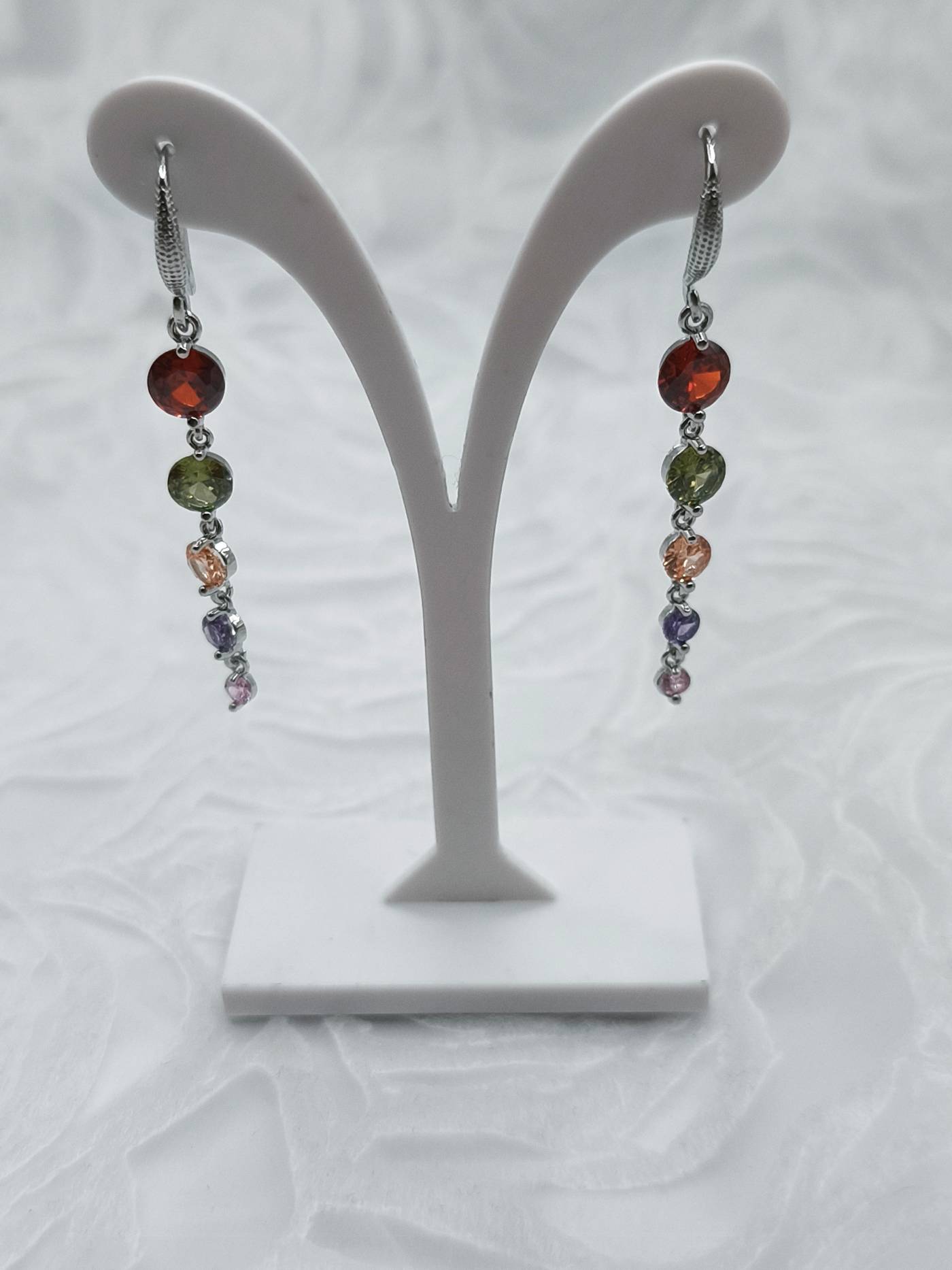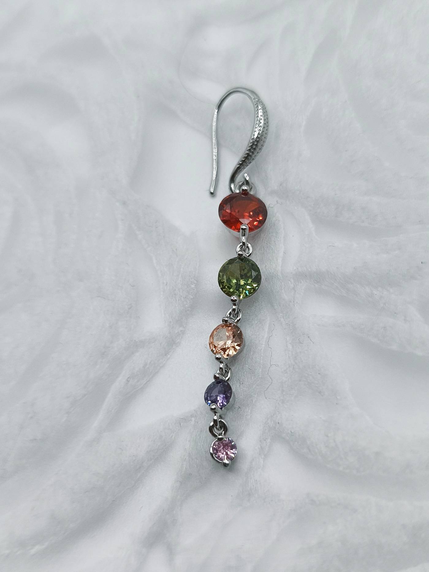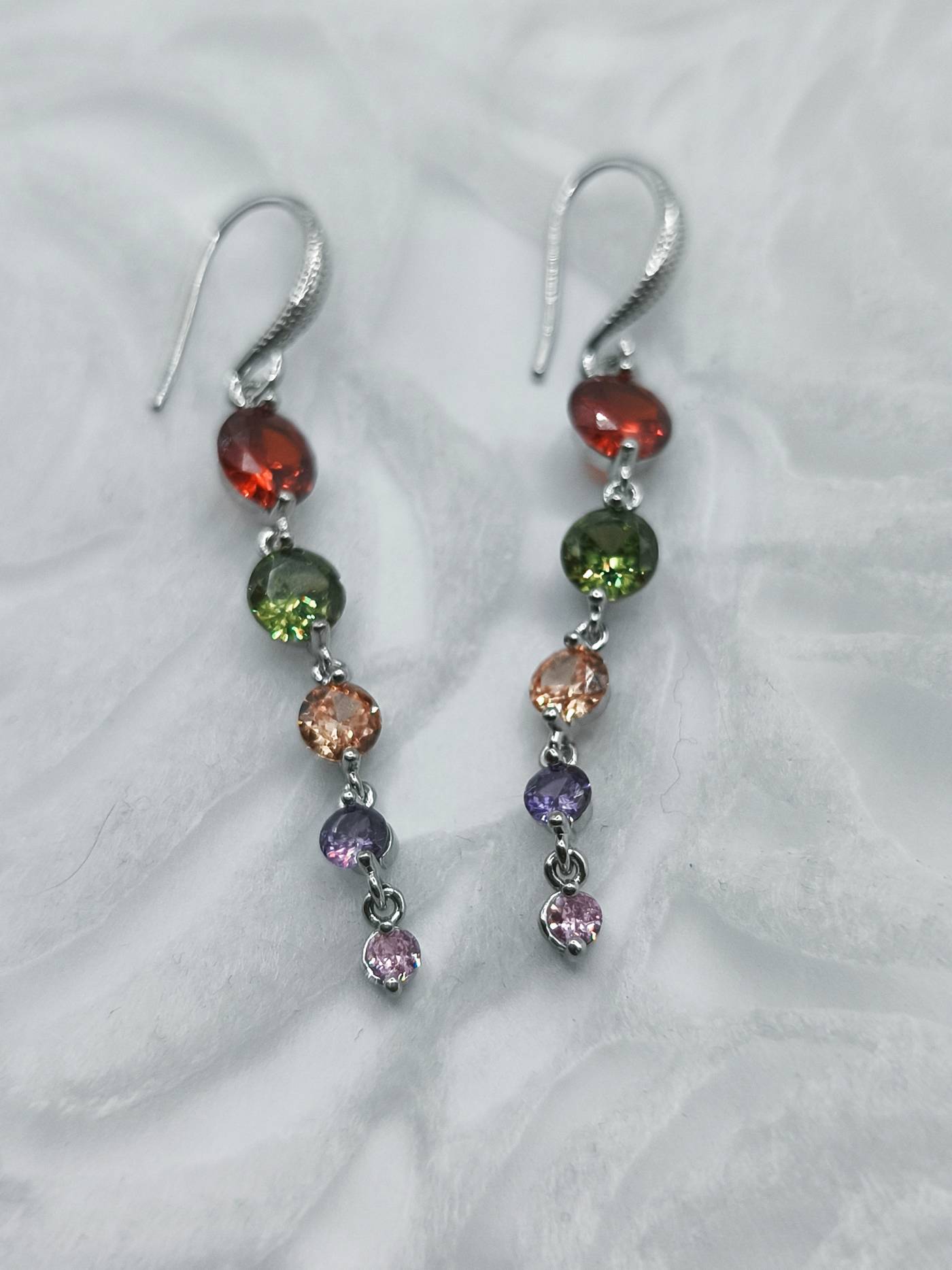 Εντυπωσιακά μακριά σκουλαρίκια που συνδυάζουν την ψυχρή λάμψη του ασημιού με μια πανδαισία χρωμάτων. Το σχέδιο αποτελείται από μια κατακόρυφη σειρά πέντε ζιργκόν σε διαφορετικές, ζωντανές αποχρώσεις, δημιουργώντας ένα παιχνιδιάρικο και ταυτόχρονα σικ “εφέ ουράνιου τόξου”. Η ασημί επιμετάλλωση αναδεικνύει τη φωτεινότητα των λίθων, προσφέροντας μια μοντέρνα και φρέσκια νότα στο στυλ σας. Είναι το ιδανικό αξεσουάρ που σας βγάζει από το δίλημμα της επιλογής, καθώς η πολυχρωμία τους τα κάνει να ταιριάζουν εύκολα με κάθε σας σύνολο.