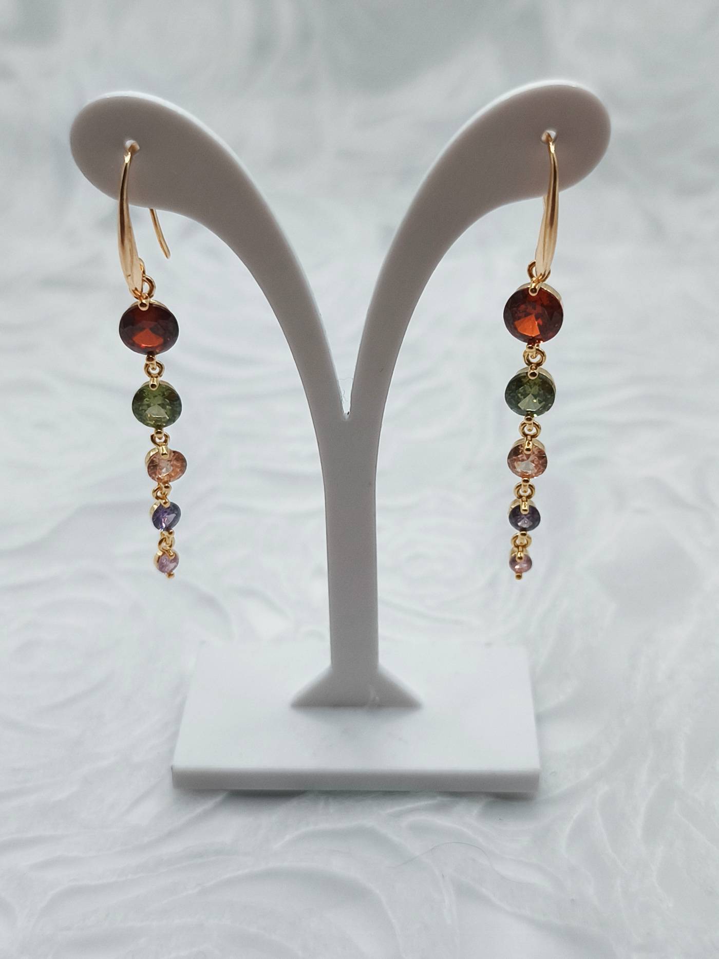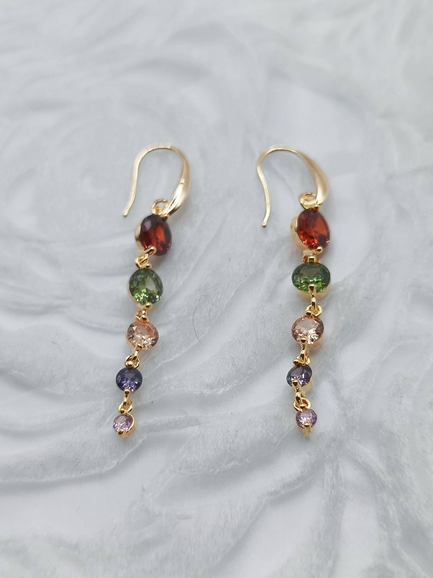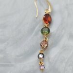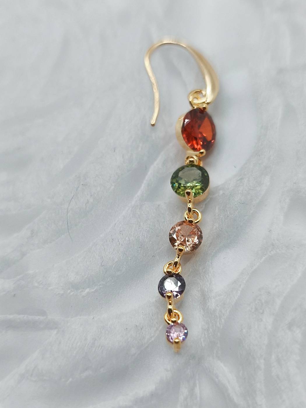 Εντυπωσιακά μακριά σκουλαρίκια που γιορτάζουν το χρώμα και τη λάμψη. Το σχέδιο αποτελείται από μια κατακόρυφη σειρά πέντε ζιργκόν σε διαφορετικές, ζωντανές αποχρώσεις, δημιουργώντας ένα μοναδικό “εφέ ουράνιου τόξου”. Η χρυσή επιμετάλλωση αγκαλιάζει αρμονικά τις πολύχρωμες πέτρες, προσφέροντας μια χαρούμενη και ταυτόχρονα κομψή νότα σε κάθε σας εμφάνιση. Είναι το ιδανικό αξεσουάρ που σας βγάζει από το δίλημμα της επιλογής, καθώς ταιριάζει με κάθε χρωματική παλέτα και προσθέτει άμεση ζωντάνια στο στυλ σας.
