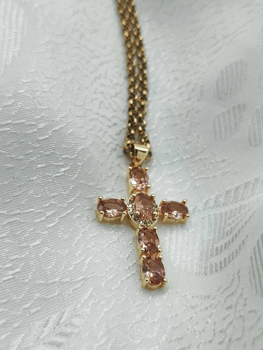 Χειροποίητο κολιέ με ατσάλινη αλυσίδα και εντυπωσιακό σταυρό από ορείχαλκο με χρυσή επιμετάλλωση. Ο σταυρός είναι περίτεχνα διακοσμημένος με κομμάτια κρυστάλλου σε ζεστό μπεζ χρώμα, δημιουργώντας μια αίσθηση διακριτικής πολυτέλειας και φινέτσας. Ένας κομψός συνδυασμός από τη συλλογή της AMAVERO που παντρεύει τη διαχρονική γοητεία με το σύγχρονο design. Ιδανικό για να προσθέσει λάμψη και στυλ σε κάθε σας εμφάνιση.