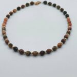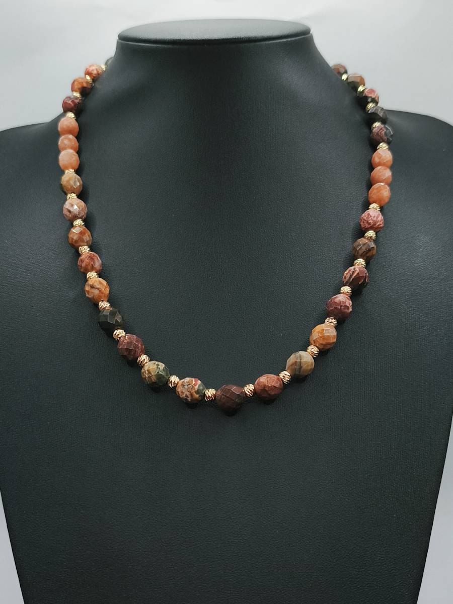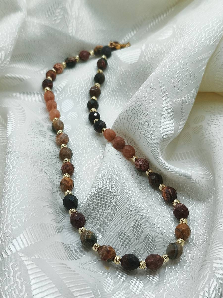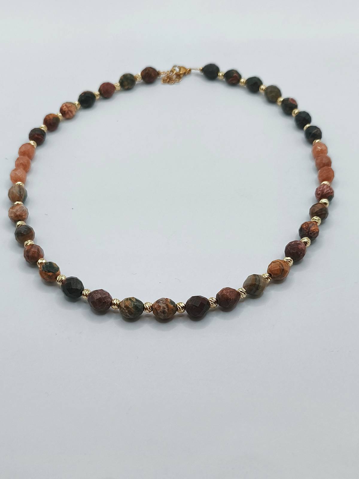 Χειροποίητο κολιέ από ημιπολύτιμους λίθους πολύχρωμου ίασπι σε οβάλ σχήμα και μαλαισιανό νεφρίτη (βαμμένο quartz). Οι λίθοι διαθέτουν πολυεδρικές κοπές που αντανακλούν το φως, προσφέροντας εξαιρετική κομψότητα και λάμψη σε κάθε σας κίνηση. Ανάμεσα στους λίθους, επιχρυσωμένα στοιχεία από ορείχαλκο προσθέτουν μια δόση γοητείας και πολυτέλειας στο σύνολο.