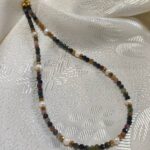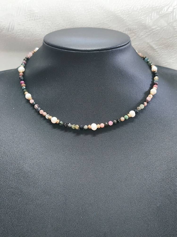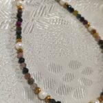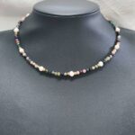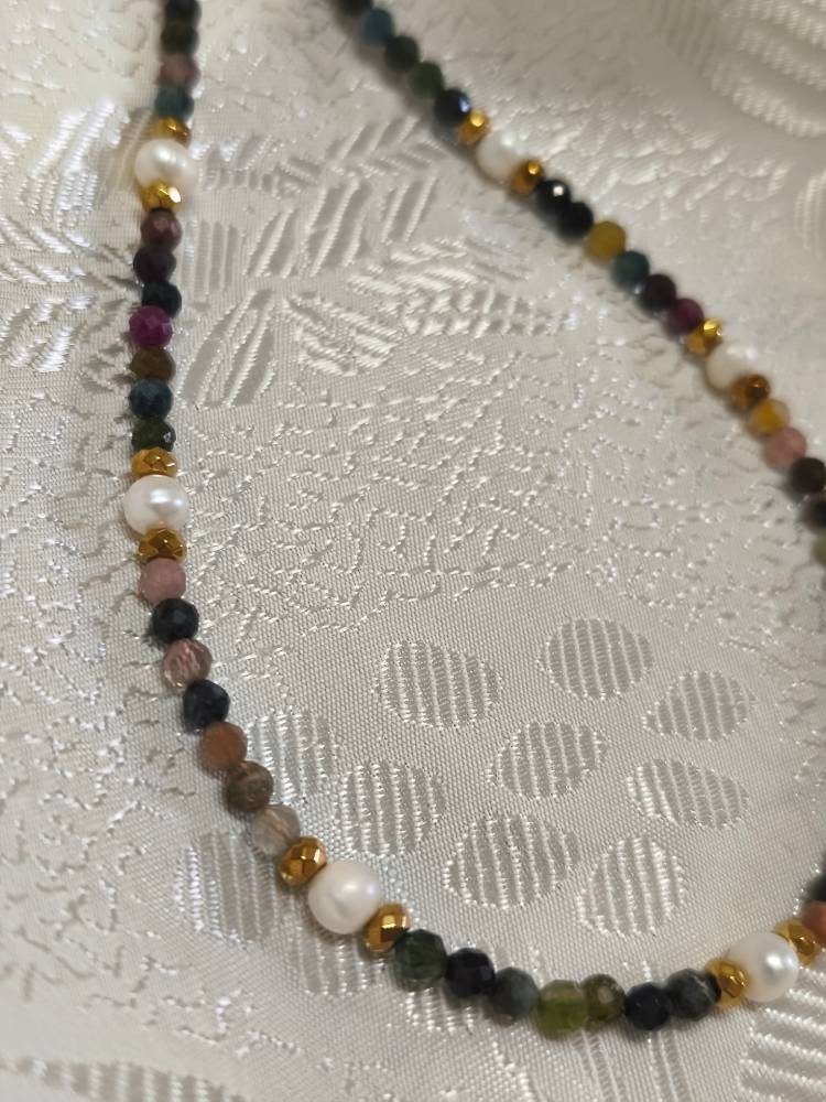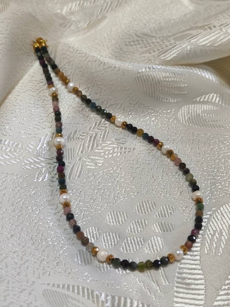 - Υλικά: Ημιπολύτιμος λίθος Τουρμαλίνη (Tourmaline) σε διάφορα χρώματα, Φυσικά Μαργαριτάρια (Natural Pearls), Στοιχεία Αιματίτη (Hematite).