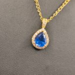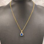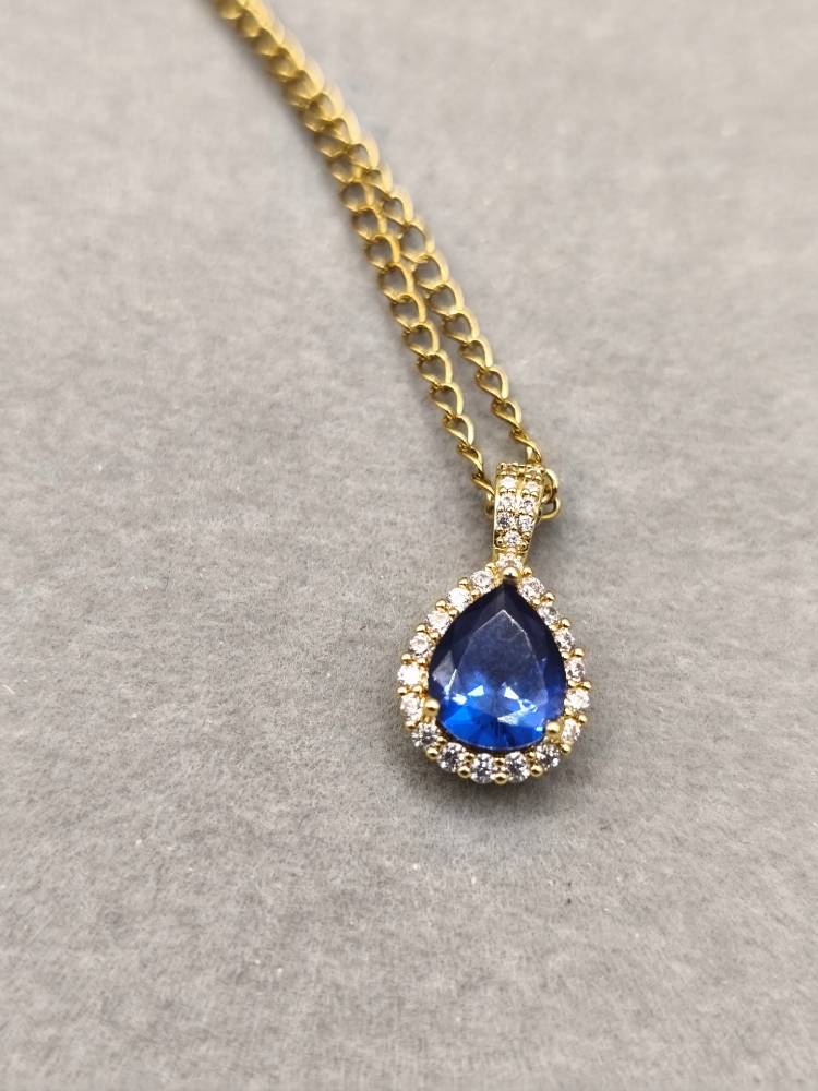 Ένα κόσμημα που αποπνέει την αριστοκρατική φινέτσα ενός σπάνιου ζαφειριού! Αυτό το εντυπωσιακό κολιέ διαθέτει ένα κεντρικό κρύσταλλο ζιργκόν σε βαθύ μπλε χρώμα και σχήμα δάκρυ (teardrop), το οποίο περιβάλλεται από ένα λαμπερό στεφάνι (halo) μικρότερων διάφανων ζιργκόν. Ο στολισμένος κρίκος του μενταγιόν προσθέτει επιπλέον φως, καθιστώντας το το απόλυτο statement κομμάτι για κάθε επίσημη εμφάνιση ή για να δώσετε μια δόση πολυτέλειας στο καθημερινό σας στυλ. Η διαχρονική του γοητεία το καθιστά ιδανικό για layering με τις χρυσές αλυσίδες της συλλογής μας.