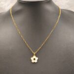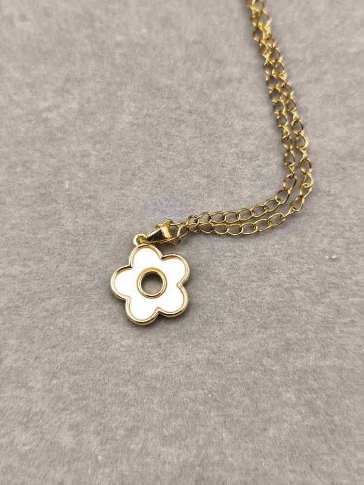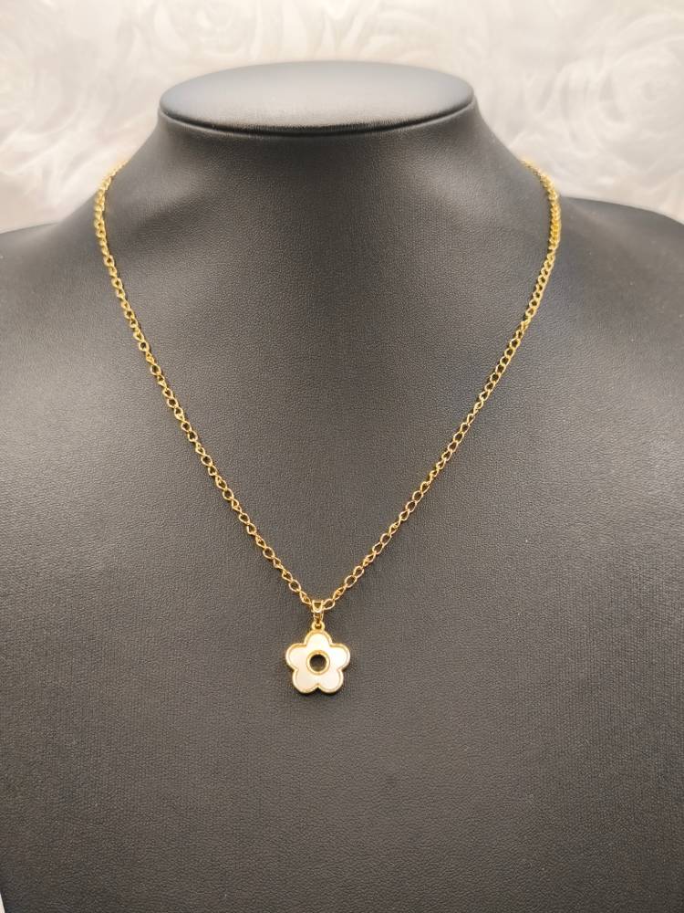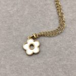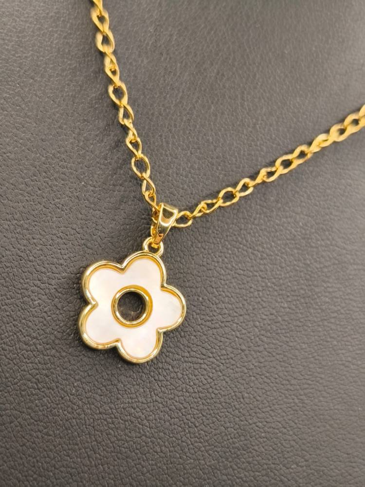 Η φρεσκάδα της άνοιξης σε ένα κόσμημα που θα λατρέψετε! Αυτό το ντελικάτο χειροποίητο κολιέ διαθέτει ένα μενταγιόν σε σχήμα λουλουδιού, φιλοτεχνημένο από φυσικό λευκό φίλντισι (shell). Ο παιχνιδιάρικος σχεδιασμός του συνδυάζεται με τη διαχρονική λάμψη του επιχρυσωμένου ορείχαλκου και την ανθεκτικότητα της ατσάλινης αλυσίδας, δημιουργώντας ένα κομμάτι που αποπνέει θηλυκότητα και φινέτσα. Ιδανικό για να φορεθεί μόνο του για ένα ρομαντικό look ή σε layering με άλλα minimal κολιέ της συλλογής AMAVERO για μια πιο μοντέρνα εμφάνιση.