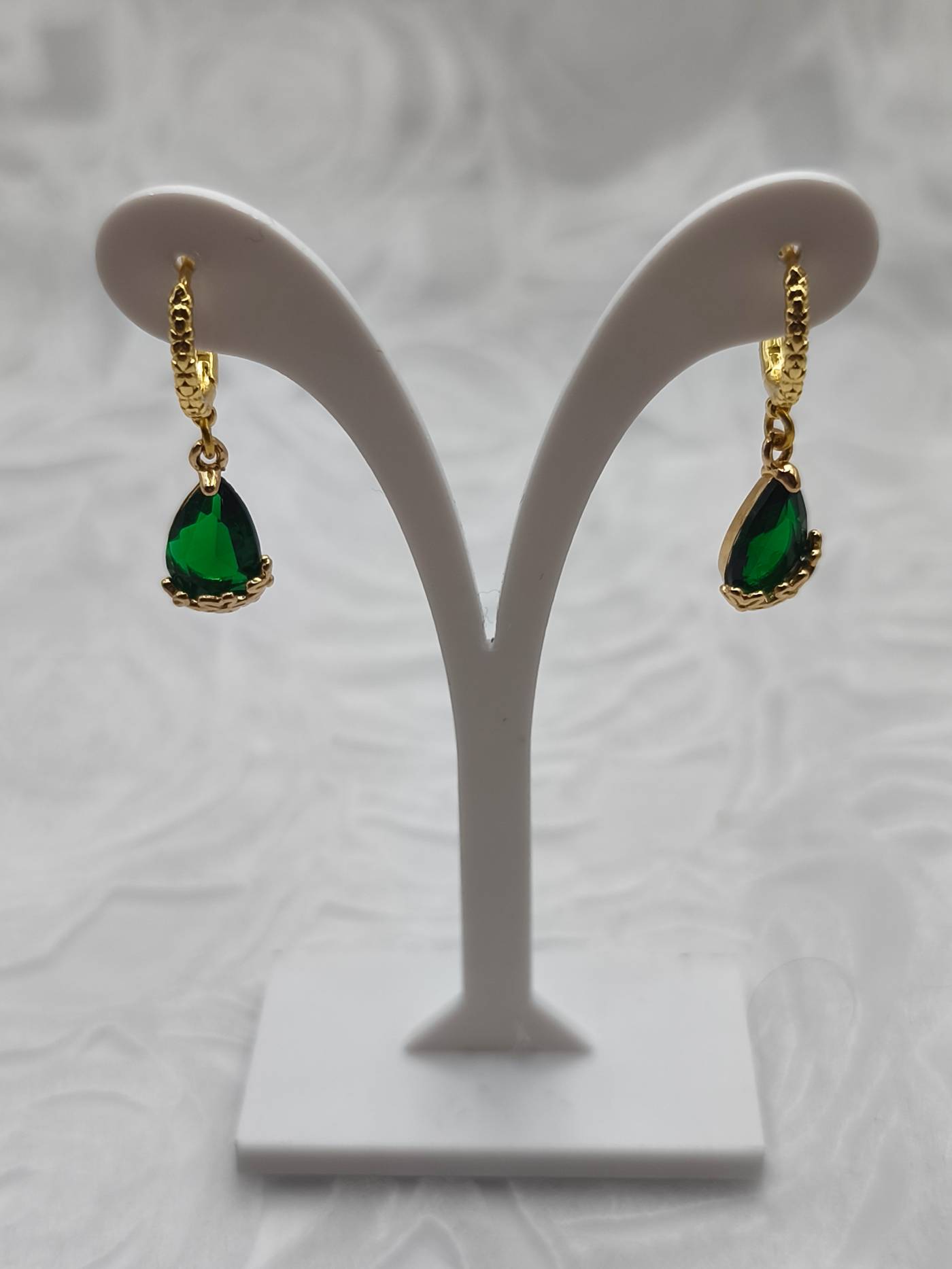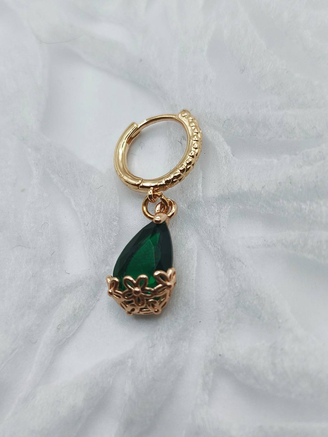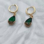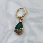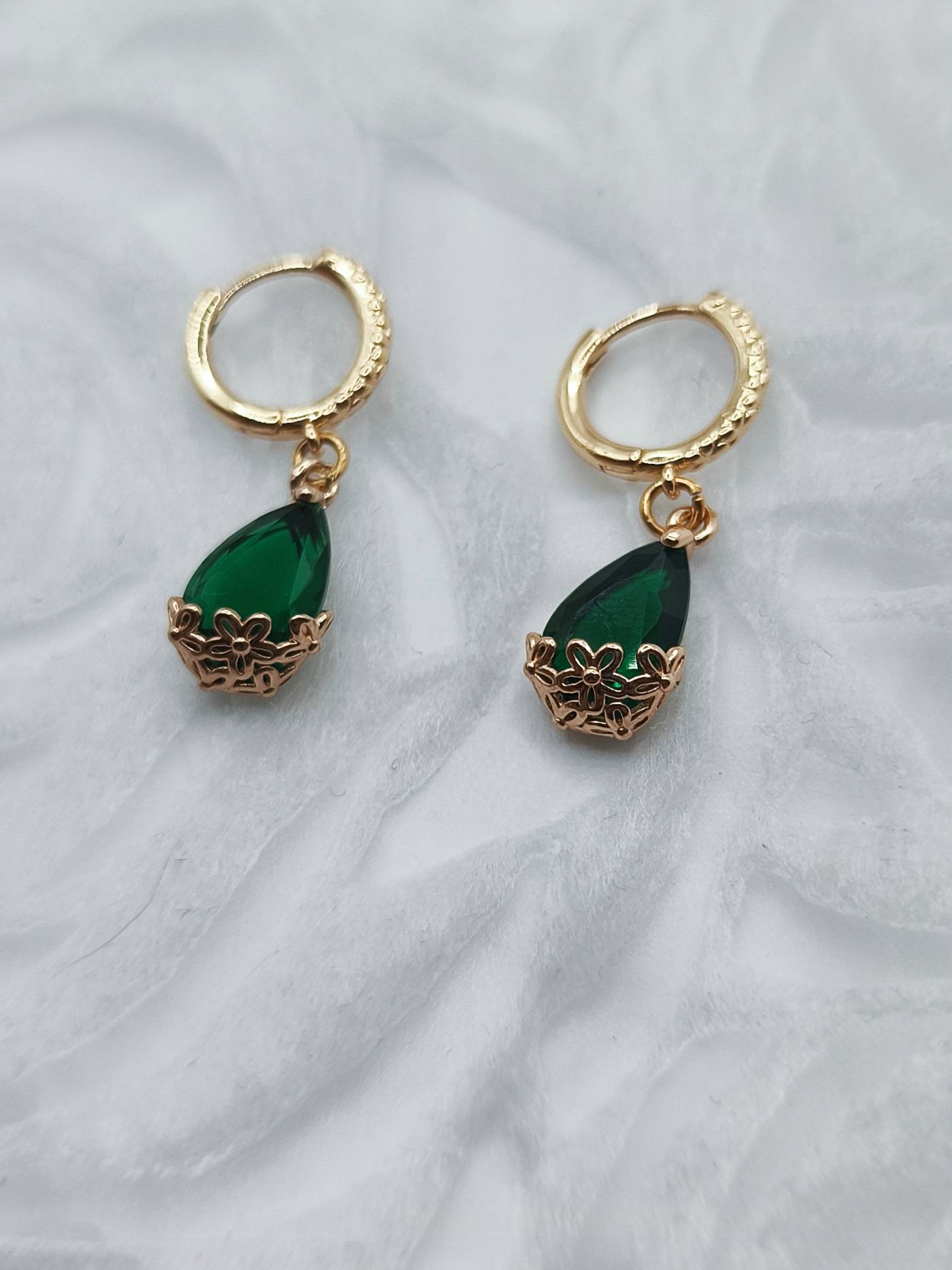Κομψά σκουλαρίκια κρικάκια που συνδυάζουν τη λάμψη του χρυσού με το βαθύ πράσινο του σμαραγδιού. Το σχέδιο αναδεικνύεται από ένα εντυπωσιακό κρύσταλλο σε σχήμα σταγόνας, το οποίο αγκαλιάζεται στη βάση του από μια λεπτομερή, ανάγλυφη ανθοδέσμη. Η vintage αισθητική τους συναντά τη σύγχρονη κομψότητα, δημιουργώντας ένα αξεσουάρ που σας βγάζει από το δίλημμα της επιλογής, καθώς είναι εξαιρετικά ευκολοφόρετο και προσθέτει μια διακριτική πινελιά πολυτέλειας σε κάθε σας εμφάνιση.